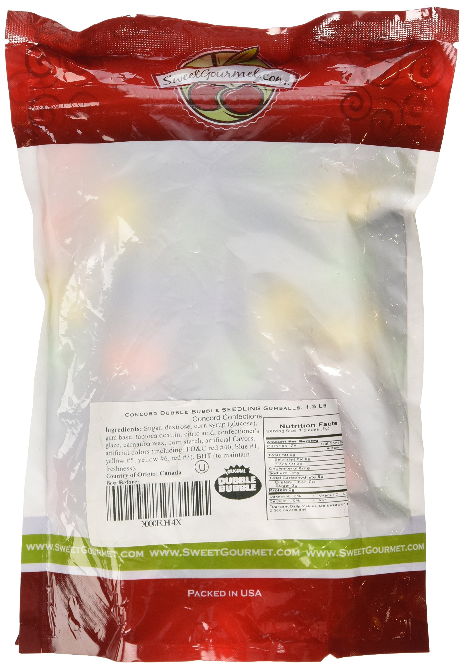 Q: What flavors are included in the SweetGourmet Concord Dubble Bubble Seedling Gum Gumballs?A: The SweetGourmet Concord Dubble Bubble Seedling Gum Gumballs feature a delightful assortment of flavors including apple, orange, lemon, strawberry, grape, and watermelon.