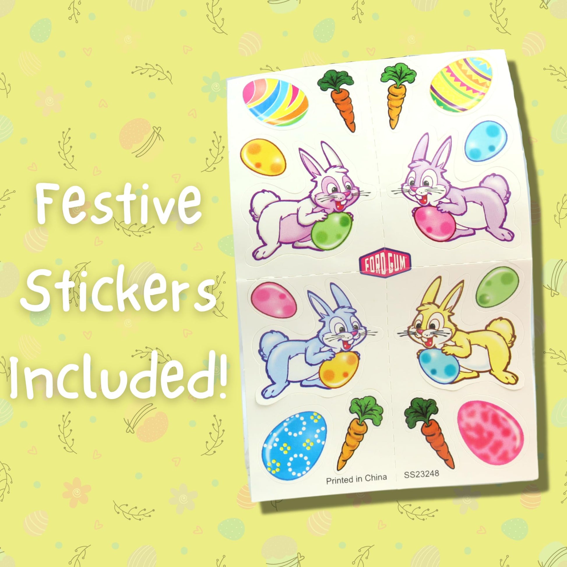 - Q: What is included with each pack of Sweetzo Easter Bubblegum Carrots? A: Each pack of Sweetzo Easter Bubblegum Carrots includes three bubblegum carrots and a playful set of bunny stickers. The stickers add an extra layer of fun to your Easter celebrations.