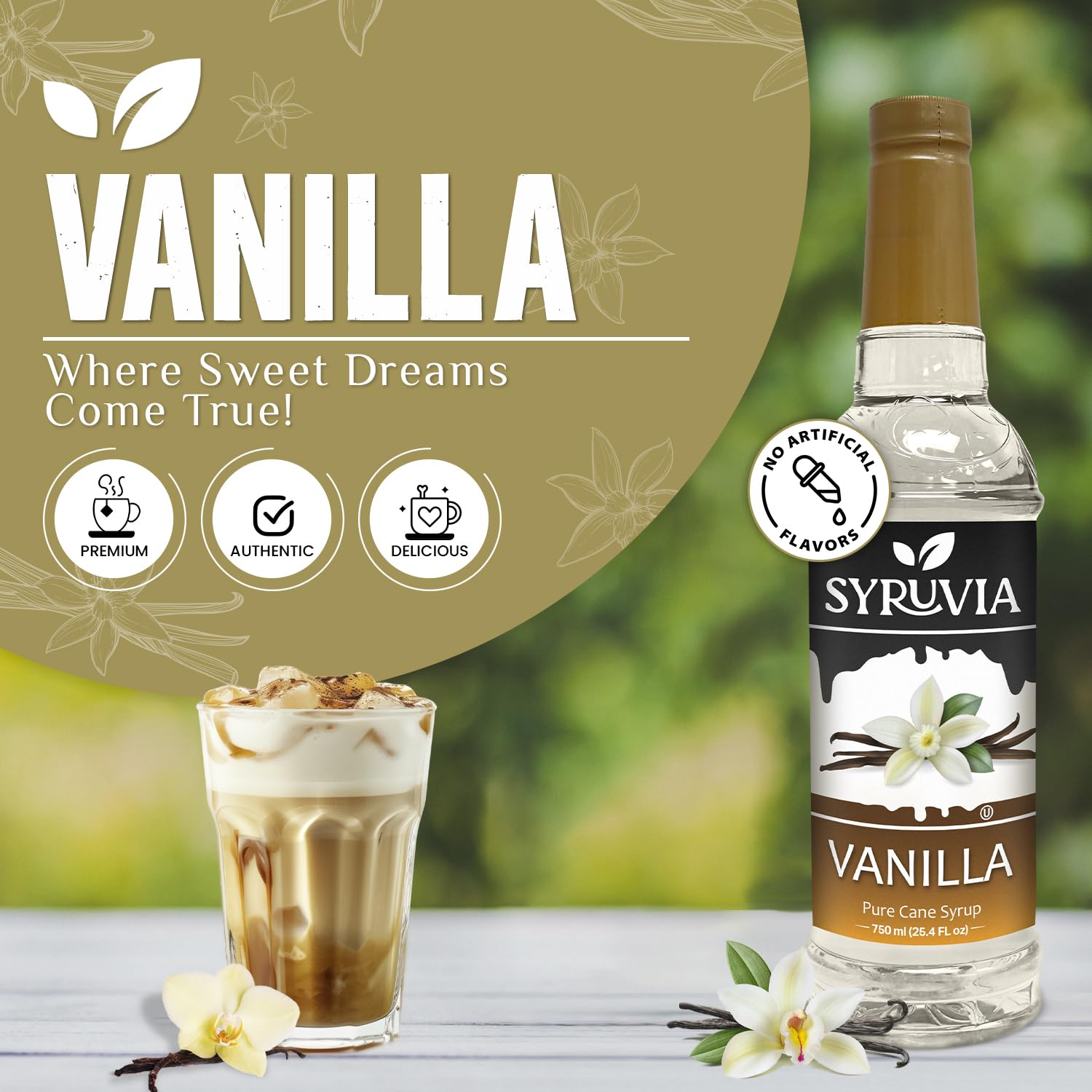 - Q: What is Syruvia Vanilla Syrup made from? A: Syruvia Vanilla Syrup is made with high-quality, clean ingredients and pure cane sugar, ensuring a rich and delicious flavor without any harsh additives or fillers.