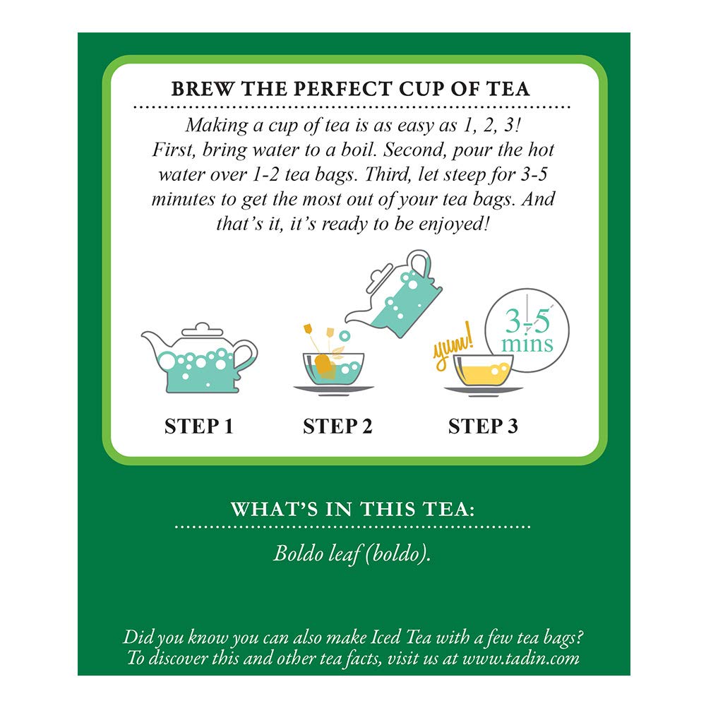 Q: How should I prepare Tadin Boldo Herbal Tea for the best flavor?A: To prepare Tadin Boldo Herbal Tea, steep one teabag in hot water for about 5-7 minutes. Adjust the steeping time according to your taste preference to achieve a robust flavor.