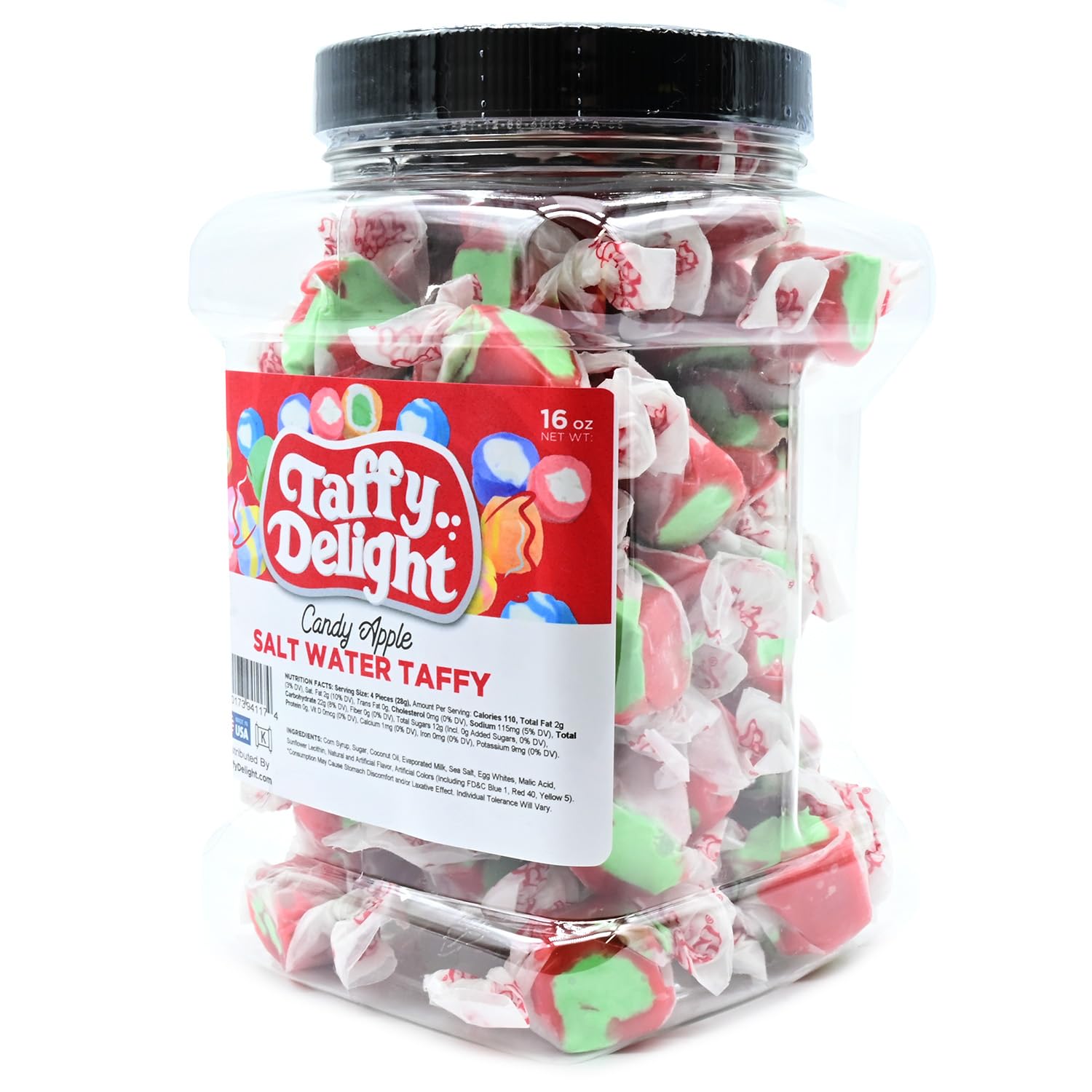 Q: What is the size of the Taffy Delight salt water taffy jar?A: The Taffy Delight salt water taffy comes in a convenient 16oz re-sealable jar, perfect for sharing or enjoying on your own.