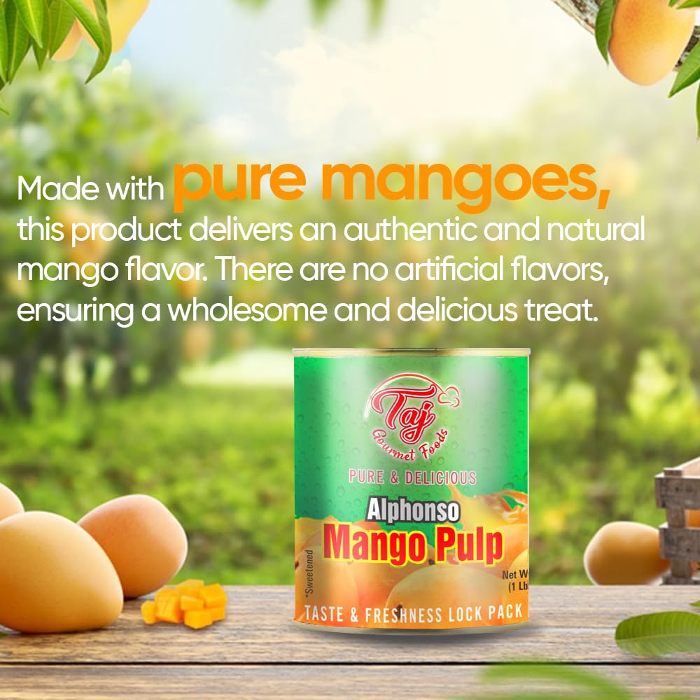 Q: Is the mango pulp made from natural ingredients?A: Yes, TAJ Alphonso Mango Pulp is made with all-natural ingredients, ensuring a pure and authentic taste without any artificial additives.