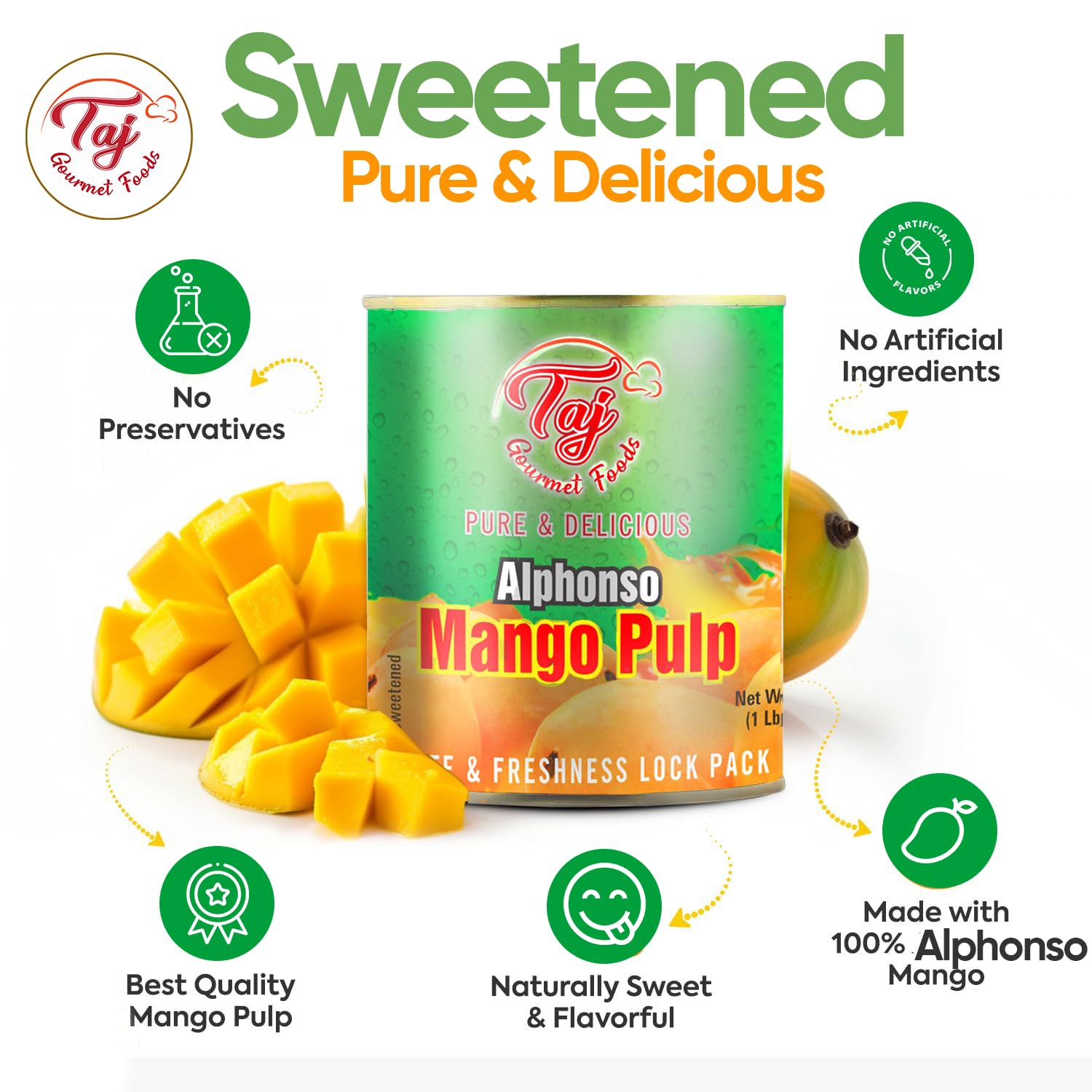 Q: What is TAJ Alphonso Mango Pulp Puree used for?A: TAJ Alphonso Mango Pulp Puree is perfect for making lassis, shakes, desserts, and various beverages. Its all-natural ingredients provide an authentic mango flavor that enhances your favorite recipes.