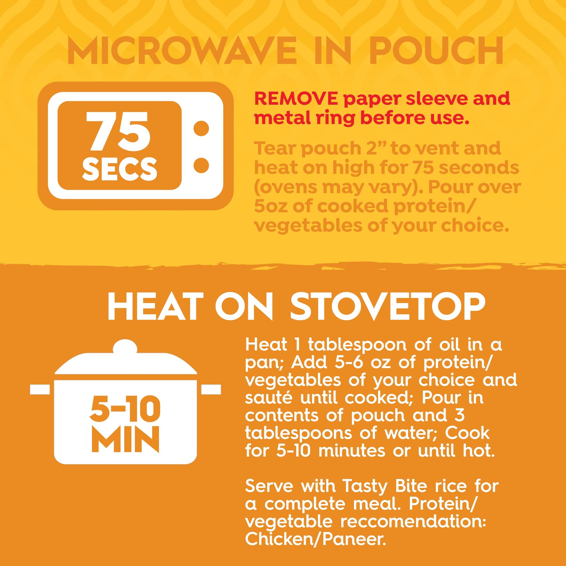 Q: How do I prepare the Butter Chicken Simmer Sauce?A: You can prepare the Butter Chicken Simmer Sauce by either microwaving it for 75 seconds or using stovetop directions. For stovetop, heat 1 tablespoon of oil in a pan, sauté 5-6 oz of protein and veggies, add the simmer pouch and 3 tablespoons of water, and cook for 5-10 minutes until hot.