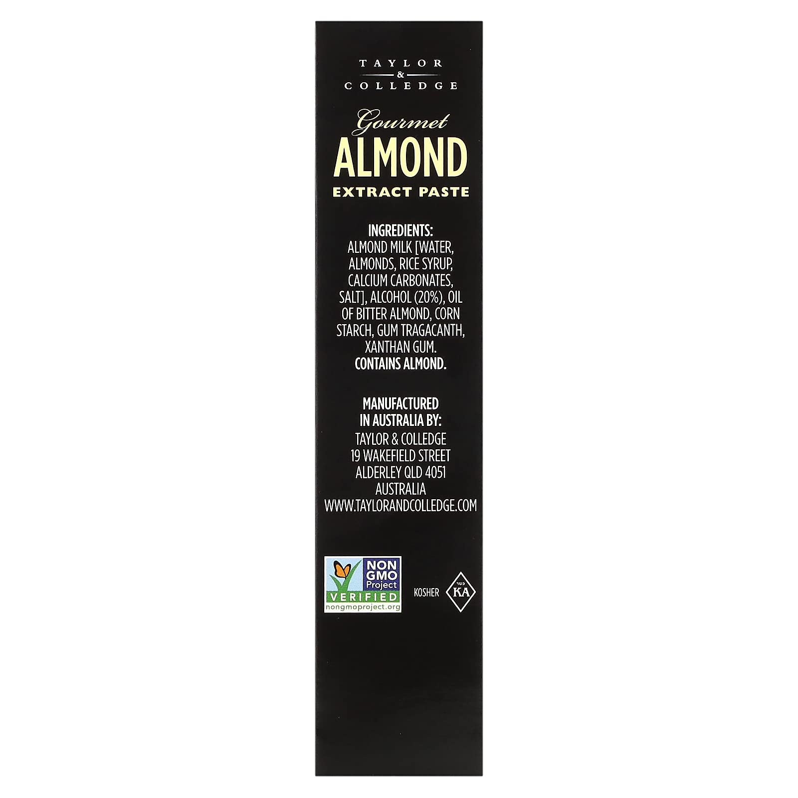 - Q: Where is Taylor & Colledge Almond Extract Paste made? A: Taylor & Colledge is an Australian company with over 120 years of history. The Almond Extract Paste is produced using traditional methods that have been refined over the years, ensuring high quality and authentic flavor.
