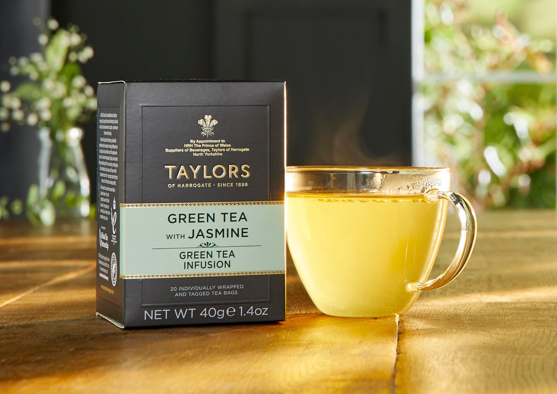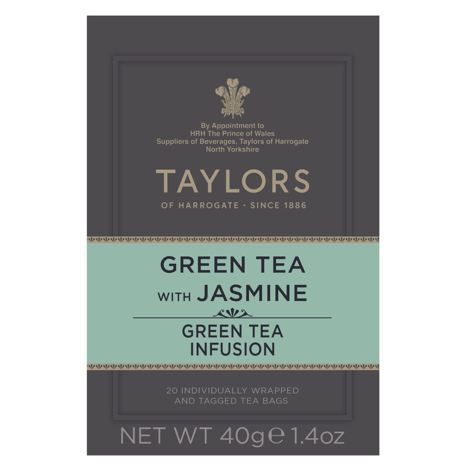 Q: What is the packaging of Taylors of Harrogate Green Tea with Jasmine like?A: Taylors of Harrogate Green Tea with Jasmine comes in a pack of 20 individually wrapped and tagged tea bags, ensuring freshness and convenience for each cup.