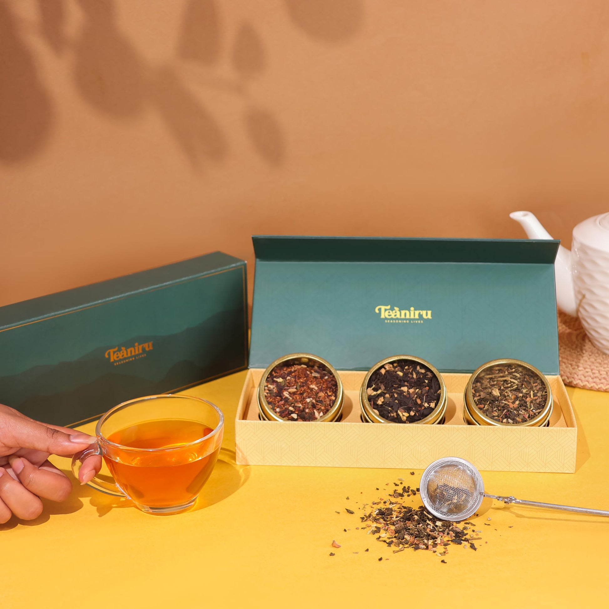 - Q: What are the health benefits of the different tea blends? A: The Winter Spice Black Tea promotes relaxation, the Rooibos Orange Herbal Tea supports heart health, and the Kashmiri Kahwa Green Tea aids in healthy digestion.