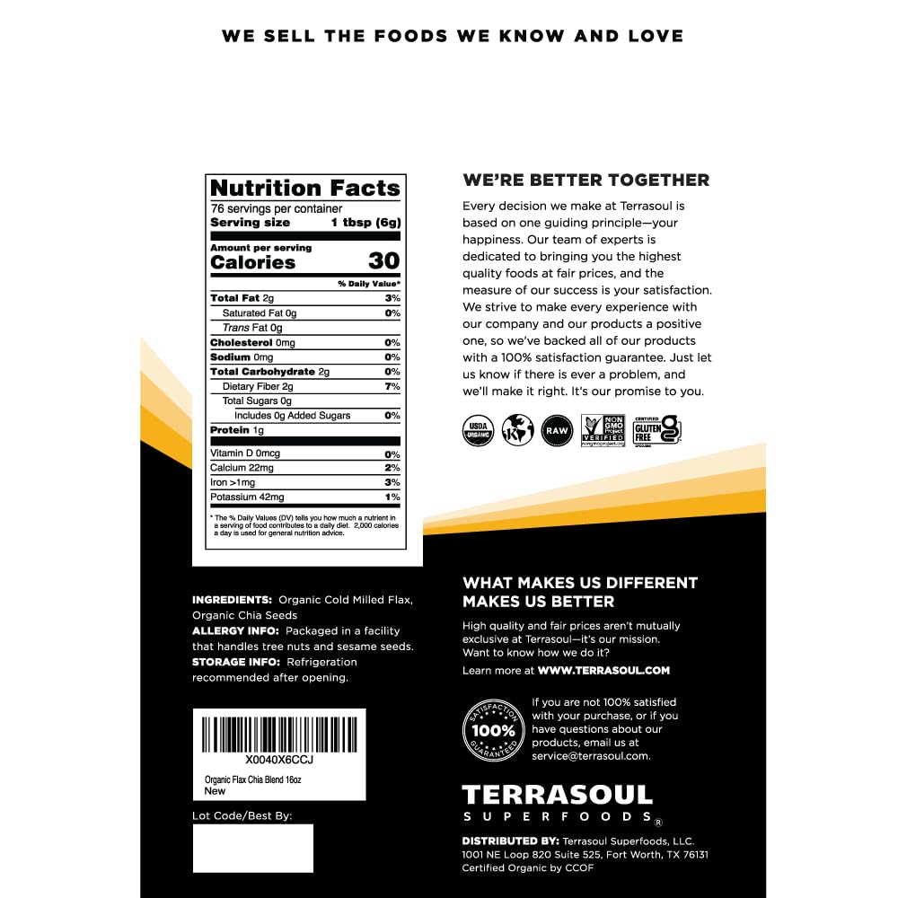 - Q: What are the health benefits of using the Terrasoul Superfoods Organic Flax Chia Blend? A: The Terrasoul Superfoods Organic Flax Chia Blend is packed with essential omega-3 fatty acids, fiber, protein, and antioxidants that support heart health, digestive wellness, and overall energy levels. Incorporating this blend into your diet can help enhance your nutrition and contribute to a healthier lifestyle.