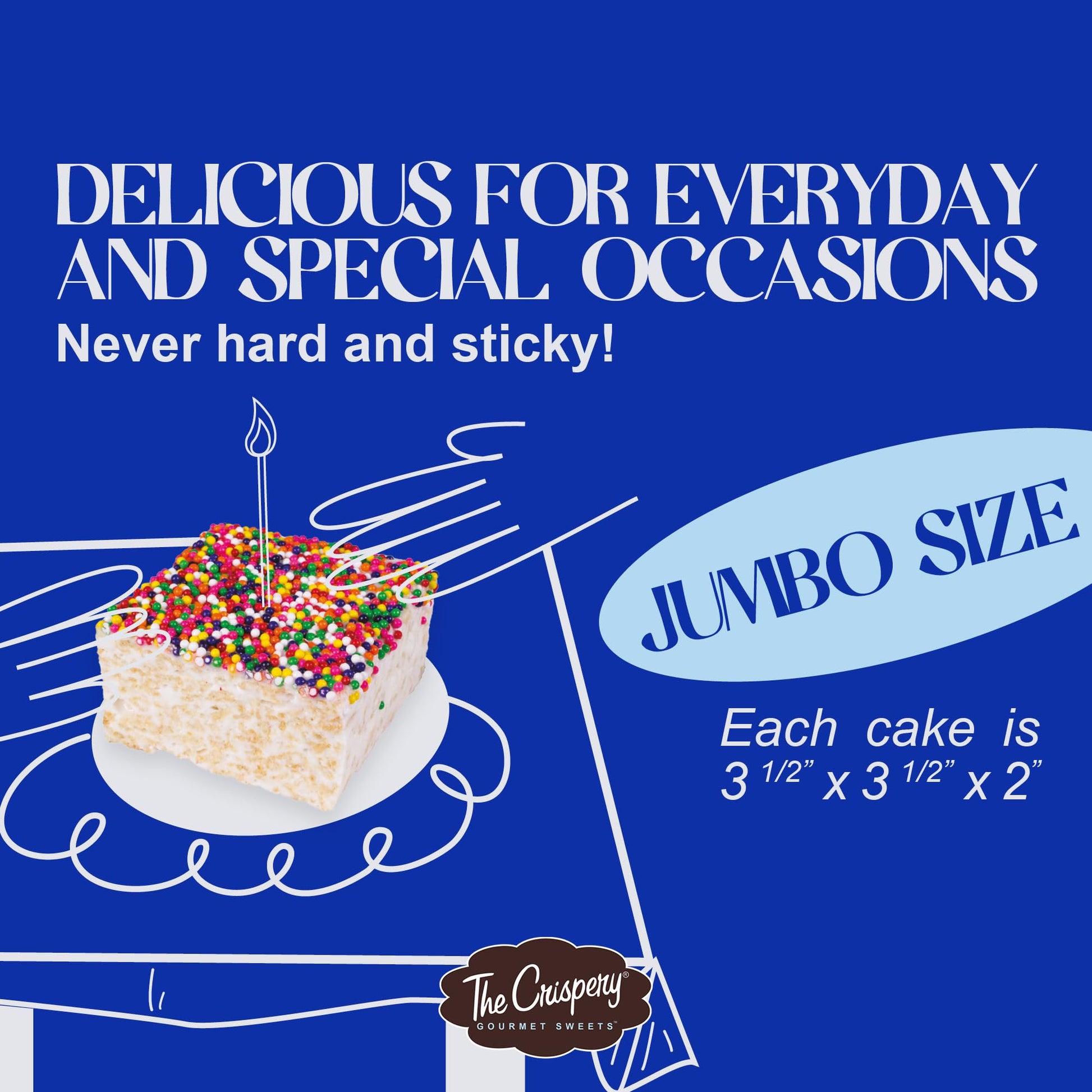 - JUMBO SIZE: Each 5 oz Crispycake is perfect for sharing, party favors, or as a convenient snack for lunch boxes.