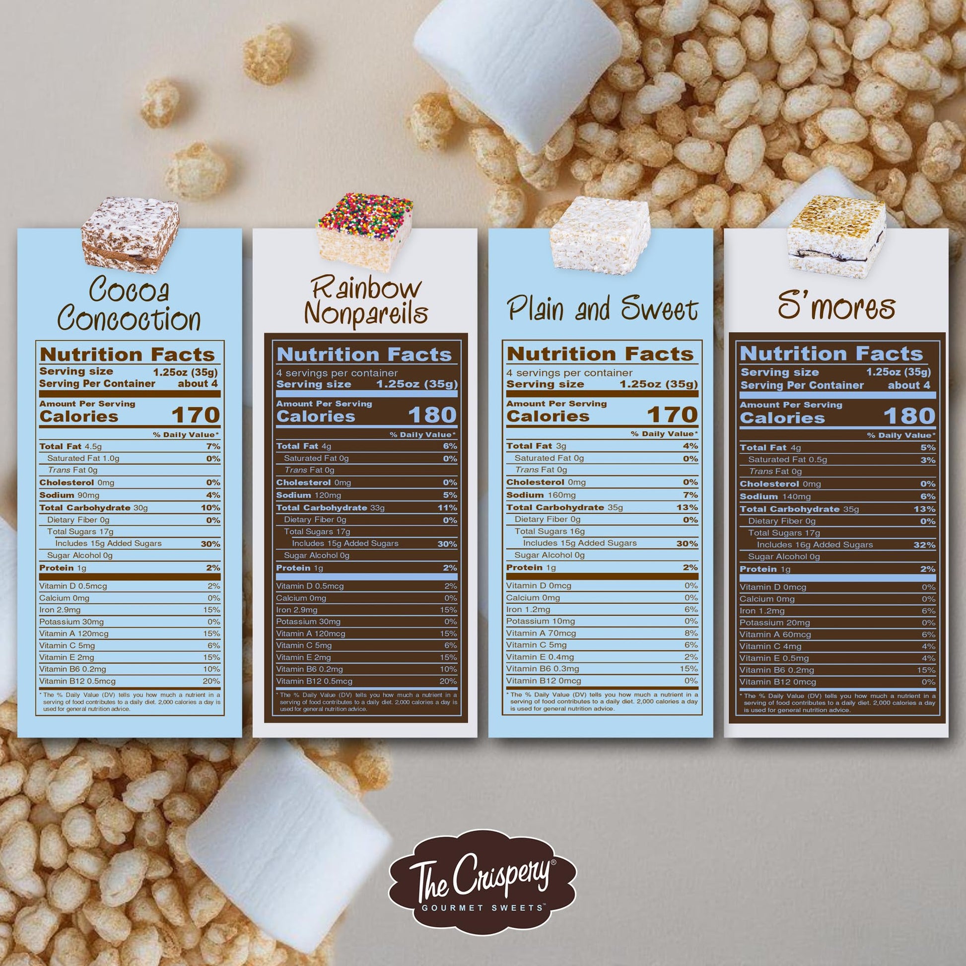 - Q: What flavors are included in The Crispery Jumbo Size Pack? A: The Crispery Jumbo Size Pack includes four flavors: Cocoa Concoction, Rainbow Nonpareils, Plain and Sweet, and S'mores, with three of each flavor in the twelve-pack.