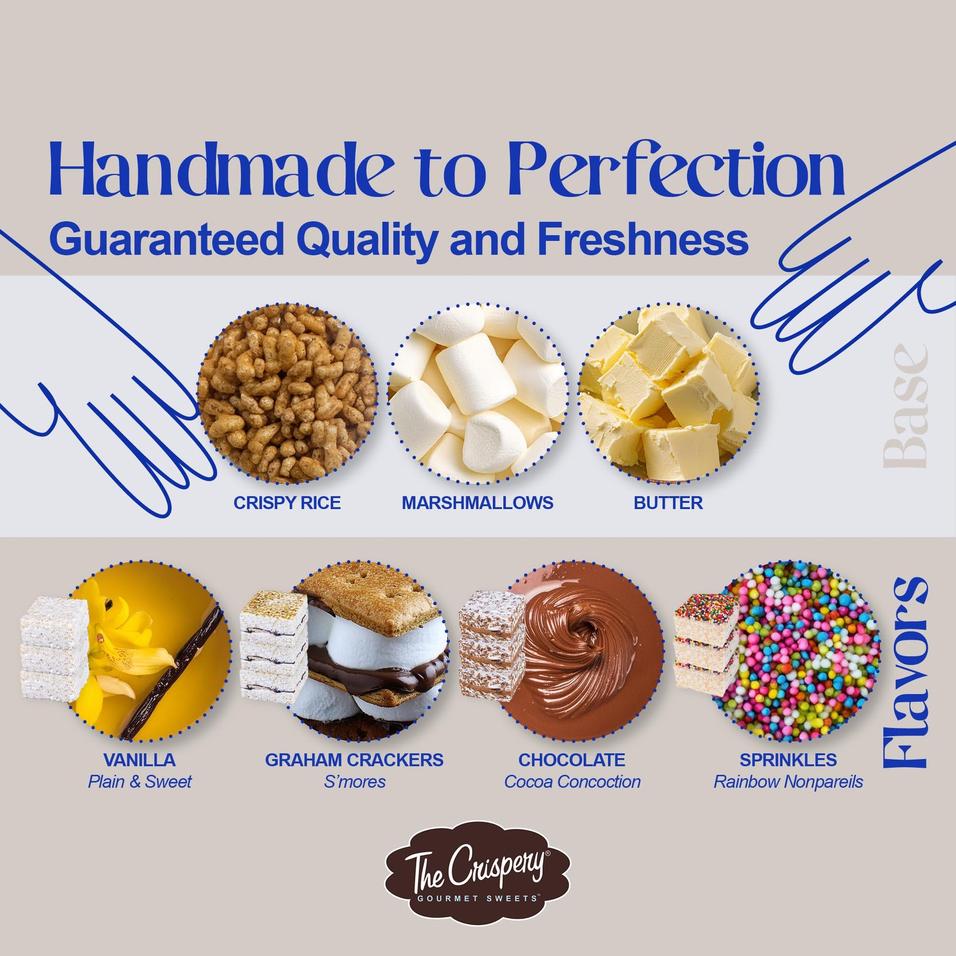 - Q: What makes The Crispery Crispycakes unique? A: The Crispery Crispycakes are unique due to their combination of gooey marshmallow and crunchy rice, along with their artisan quality and variety of flavors.