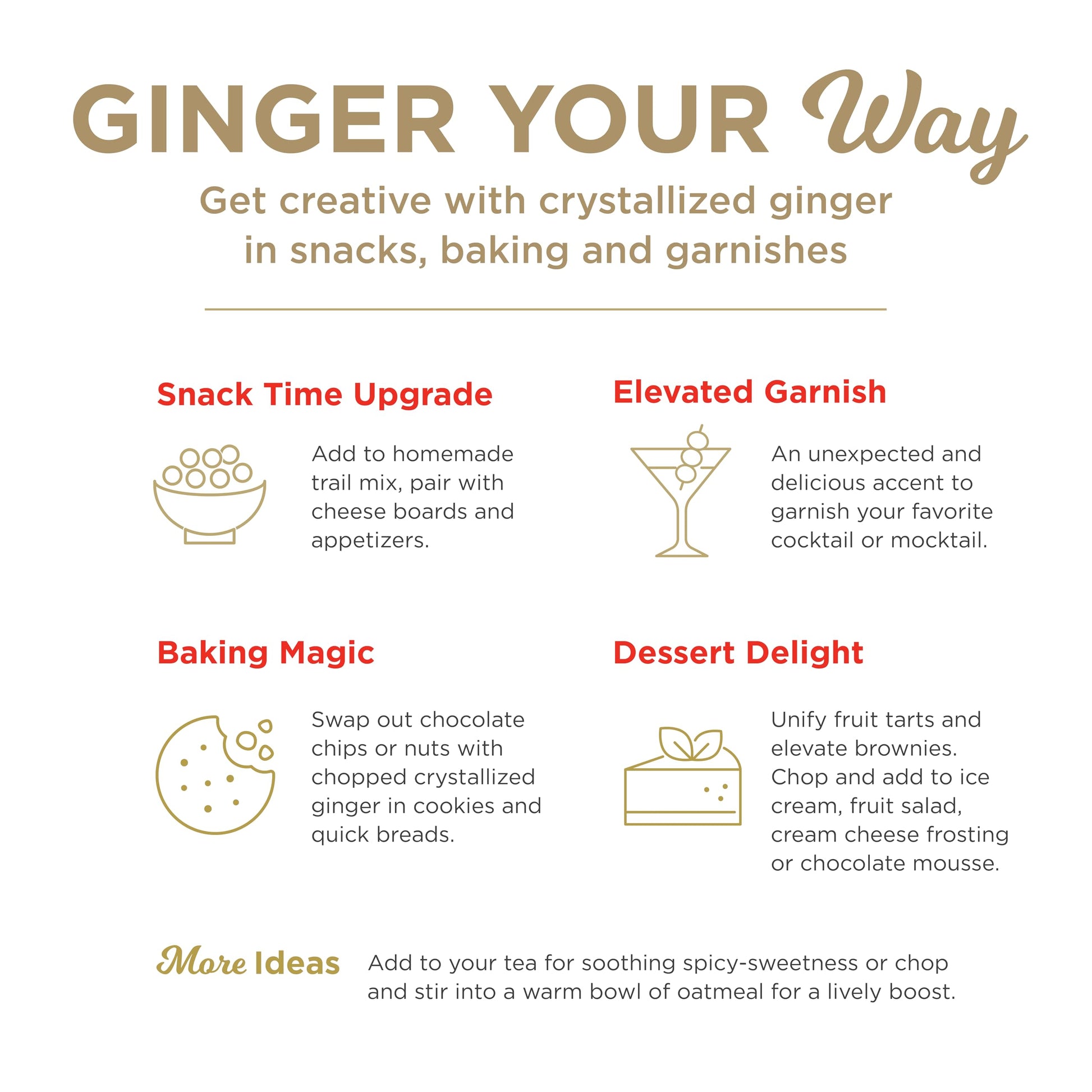 Q: How can I use Crystallized Ginger in my recipes?A: You can enhance a variety of dishes with Crystallized Ginger. It’s perfect for adding a spicy-sweet kick to pancakes, yogurt, trail mix, cookies, muffins, pastries, and more. It can also be used in gourmet cheese boards, fruit platters, or tossed into glazed nuts and popcorn.