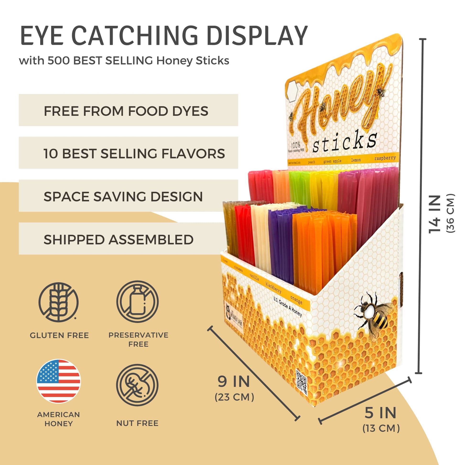 Honey Sticks Have Been A Novelty Candy For More Than 20 Years. Retail Ready Cardboard Honey Stick Display With 500 Honey Sticks. Blackberry, Peach, Watermelon, Lemon, Clover, Green Apple, Vanilla, Raspberry, Cinnamon, Orange Manufactured With Us Honey In Ogden, Utah By A Family Company. Display Measures 13'' Tall X 9'' Wide X 5'' Deep And Holds 500 Honey Sticks (Included) Sticks Retail From $.25 To $.75 Each. Perfect For Boutiques, Grocery, Gift Store, Convenience Store, Country Store, Health Food Store. No Food Coloring, Gluten-Free, No High Fructose Corn Syrup