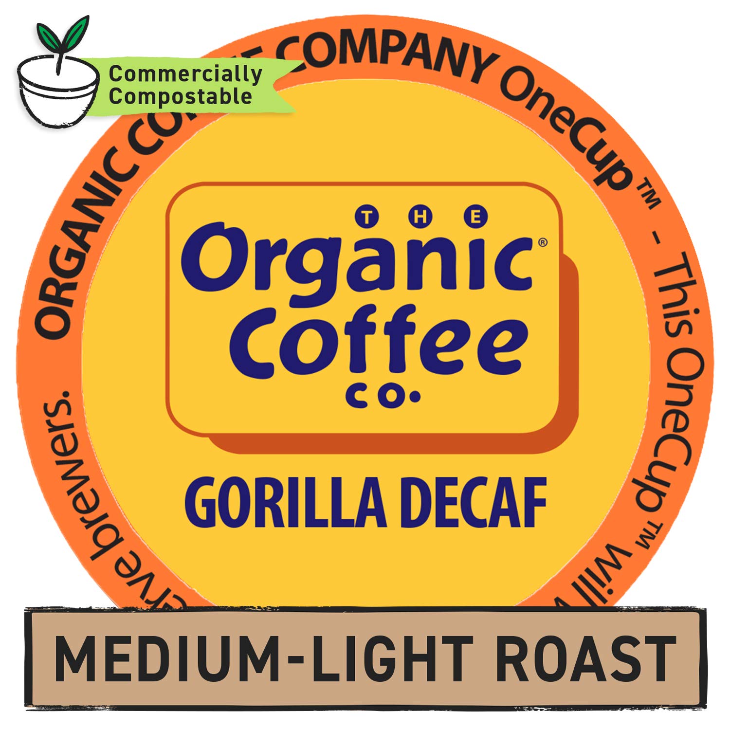 Q: What is the flavor profile of the Gorilla Decaf coffee?A: Gorilla Decaf coffee features a full-City roasted taste that is strong yet mellow, made from 100% organic, shade-grown Arabica beans, resulting in a complex and delicious cup.