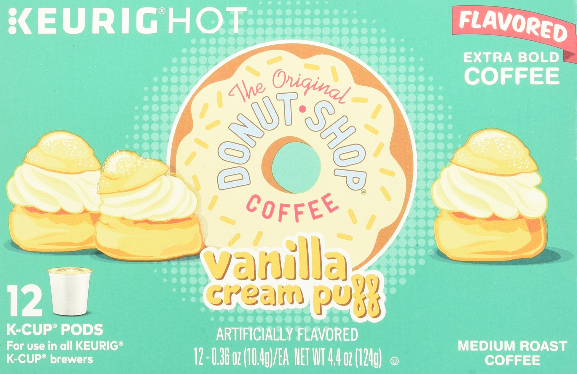 Q: What flavors are available in THE ORIGINAL DO Keurig Green Mountain Donut Shop Coffee?A: THE ORIGINAL DO Keurig Green Mountain Donut Shop Coffee is available in a delightful Vanilla Puff flavor, providing a sweet and creamy coffee experience.