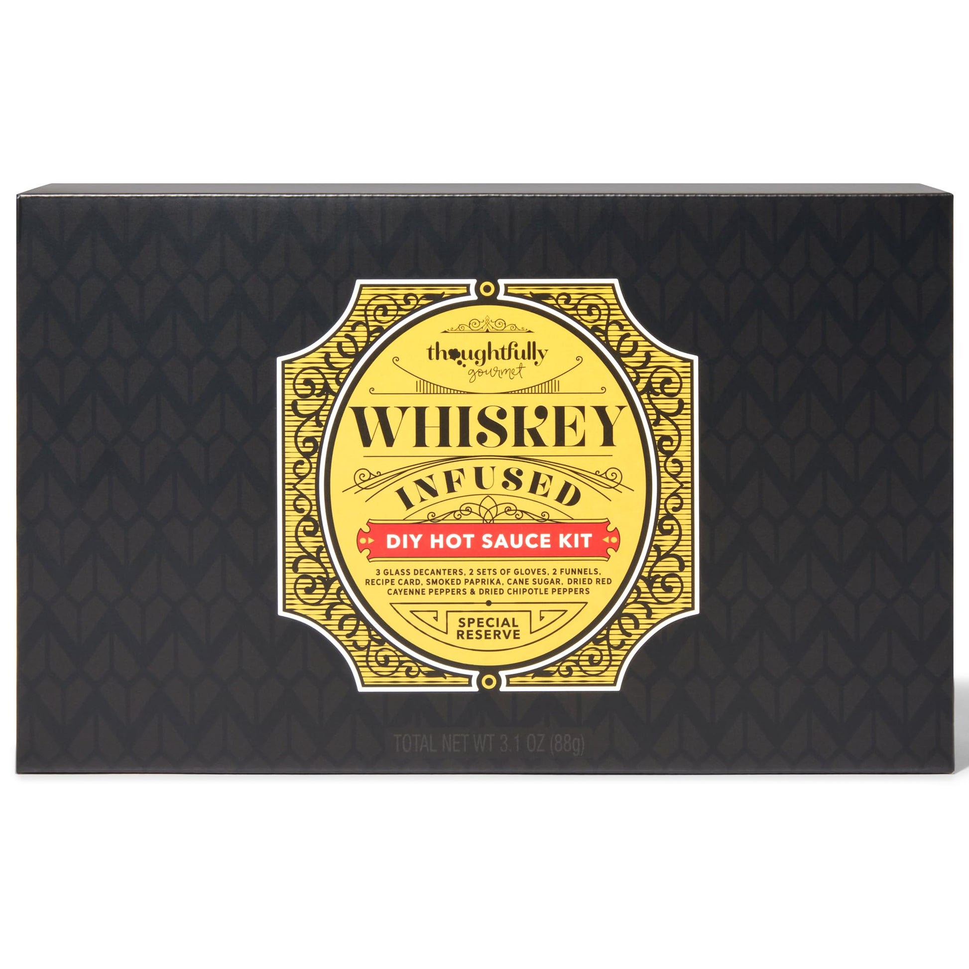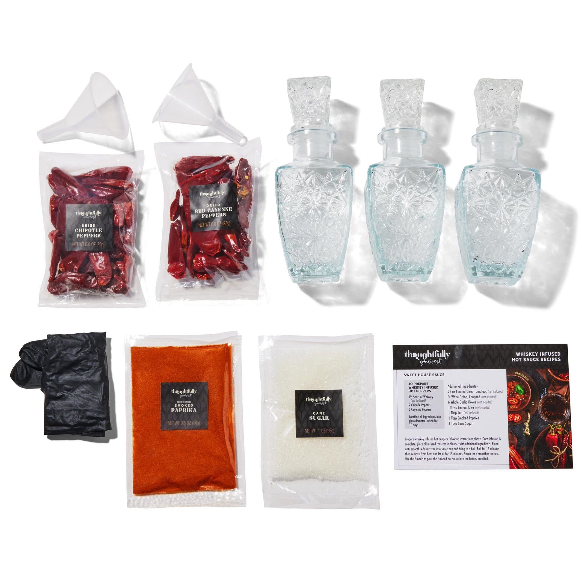 - Q: What is included in the Thoughtfully Gourmet Make Your Own Whiskey Infused Hot Sauce DIY Gift Set? A: The set includes two glass decanters, a recipe book, gloves, two funnels, a variety of peppers, and assorted spices and seasonings. It contains no alcohol.