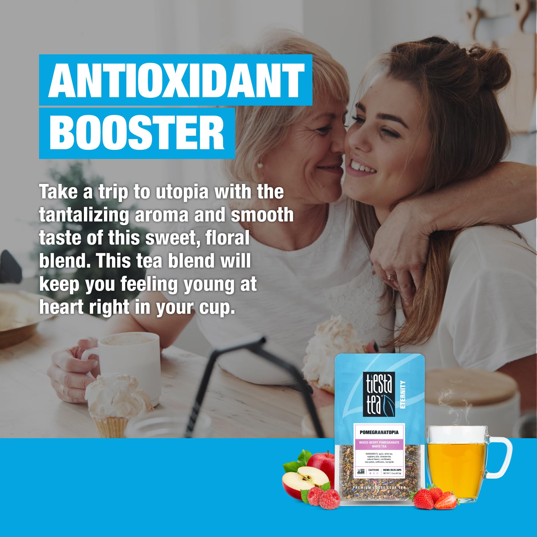 Q: What are the main ingredients in Tiesta Tea's Pomegranatopia?A: Tiesta Tea's Pomegranatopia blend features premium loose leaf white tea, along with natural ingredients such as apple, raspberry bits, strawberries, and natural flavors that create a delightful mixed-berry pomegranate taste.