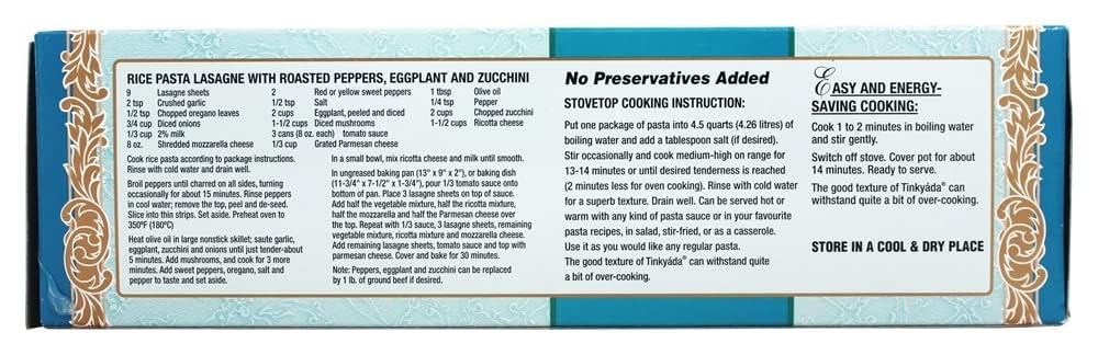 Q: Can I use Tinkyada Brown Rice Pasta Lasagne in traditional lasagna recipes?A: Absolutely! Tinkyada Brown Rice Pasta Lasagne can be used in traditional lasagna recipes just like wheat-based pasta. It holds up well in layers with sauce and cheese.