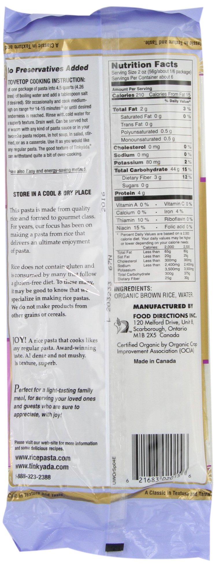 Tinkyada Brown Rice Spaghetti 12 Oz Tinkyada. Save on Tinkyada Brown Rice Spaghetti ( 12 OZ). Pasta Joy Ready. A classic in texture and taste. Wheat free. Gluten-free. Good consistent texture. Not mushy. Al Dente. We specialize - Our entire factory premise and all machines are dedicated to the manufacture of rice pasta-no other grain or cereal to prevent cross-grain contamination at production. Cholesterol free. Low fat. Low sodium. Source of fiber. Easy to digest. Promising a delightful eating experience. from whole-grain. Kosher Certified. 100% Organic. Certified Organic. Just right! Perfect for a light healthy and tasty family meal for serving your loved ones and guests who are sure to appreciate with joy! No preservatives added. Premium product from 100% quality rice stone-ground and formed to gourmet class. An ultimate in the enjoyment of pasta.