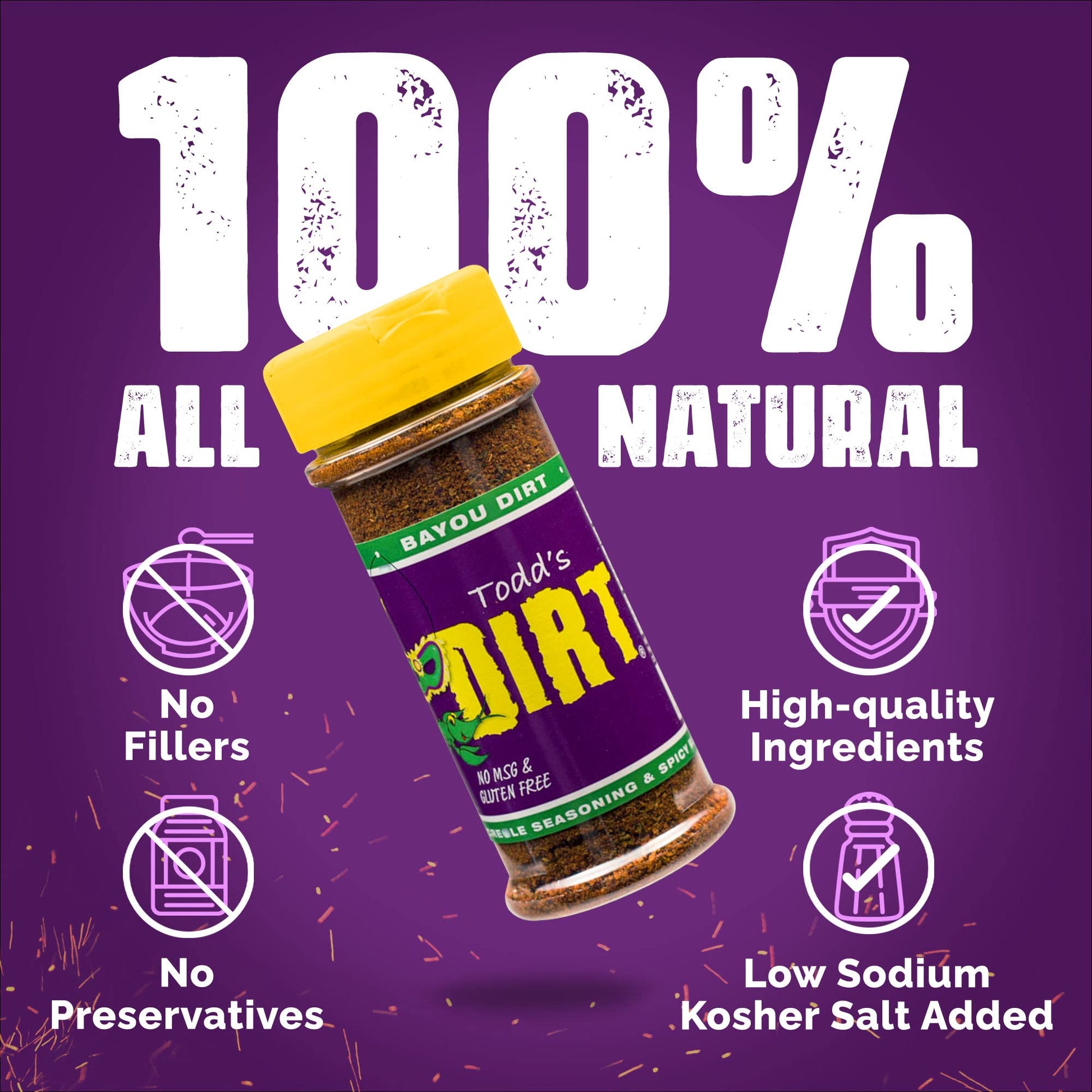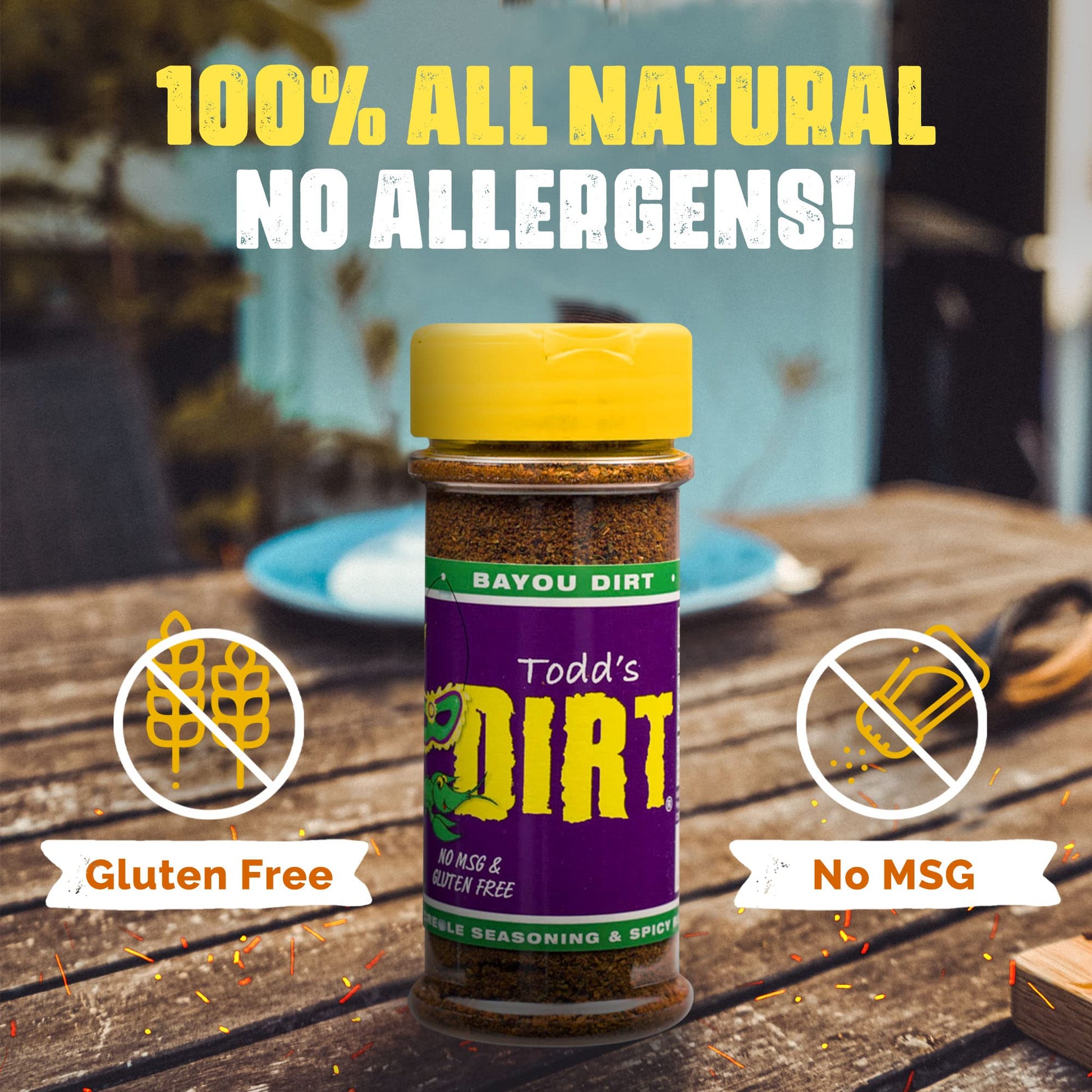 Q: Is Todd’s DIRT seasoning gluten-free and natural?A: Yes, Todd’s DIRT seasoning is 100% all-natural, gluten-free, and contains no MSG, ensuring a healthy option for your culinary needs.