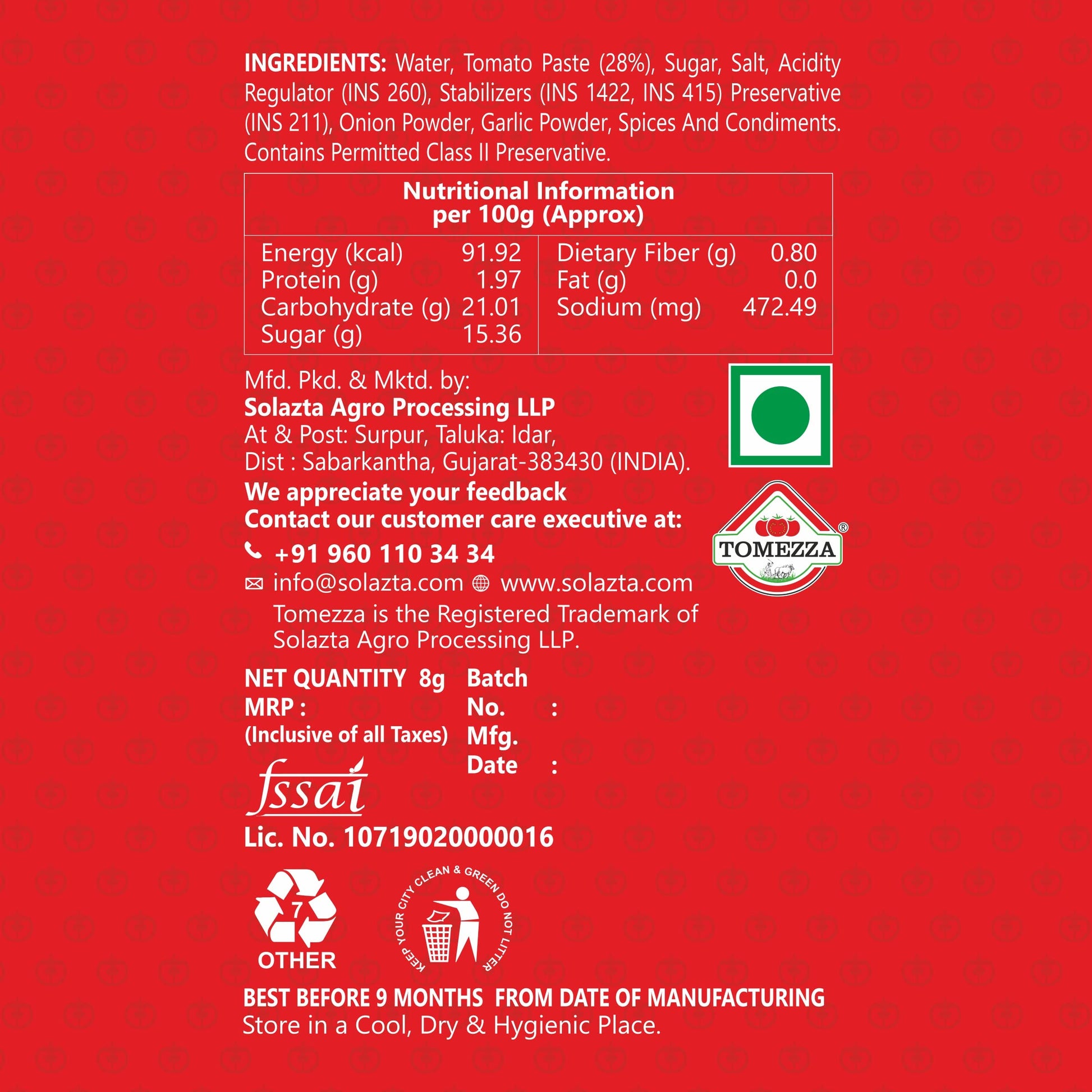 Tomezza Tomato Ketchup Sachet (Pack of 200) brings to you tomato ketchup with the goodness of fresh and delicious tomatoes. We use high-quality ingredients so that our ketchup tastes delicious. We are farmers and working to discover natures inherent quality and delivering it to the community in its natural way.