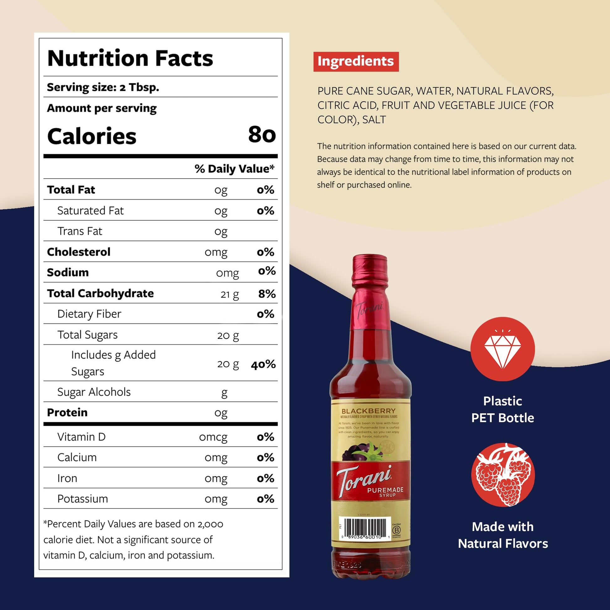 Torani Puremade Blackberry Syrup Will Delight Your Senses With Its Sweet-Tart, Bramble Berry Taste. Craft A Classic Italian Soda With A Splash Of Syrup And Sparkling Water, Or Add A Fun, Flavorful Twist To Iced Tea Or Lemonade. Let Your Creativity Flow And Enjoy The Vibrant, Sweet Flavor In Every Sip! Torani Drink Syrups Liven Up An Iced Latte, Add Pizzazz To A Soda, Or Put More Oomph In Iced Tea. Theres No Wrong Way To Go About It. We Have Flavors For Every Moment, So You Can Flavor Your Way, No Matter Where Life Takes You. Each Bottle Also Promises Our Dedication To Help All The People, Partners, And Communities We Touch Thrive. We Believe That Everything Starts With People And That Businesses Can, And Should, Create More Opportunities For People.