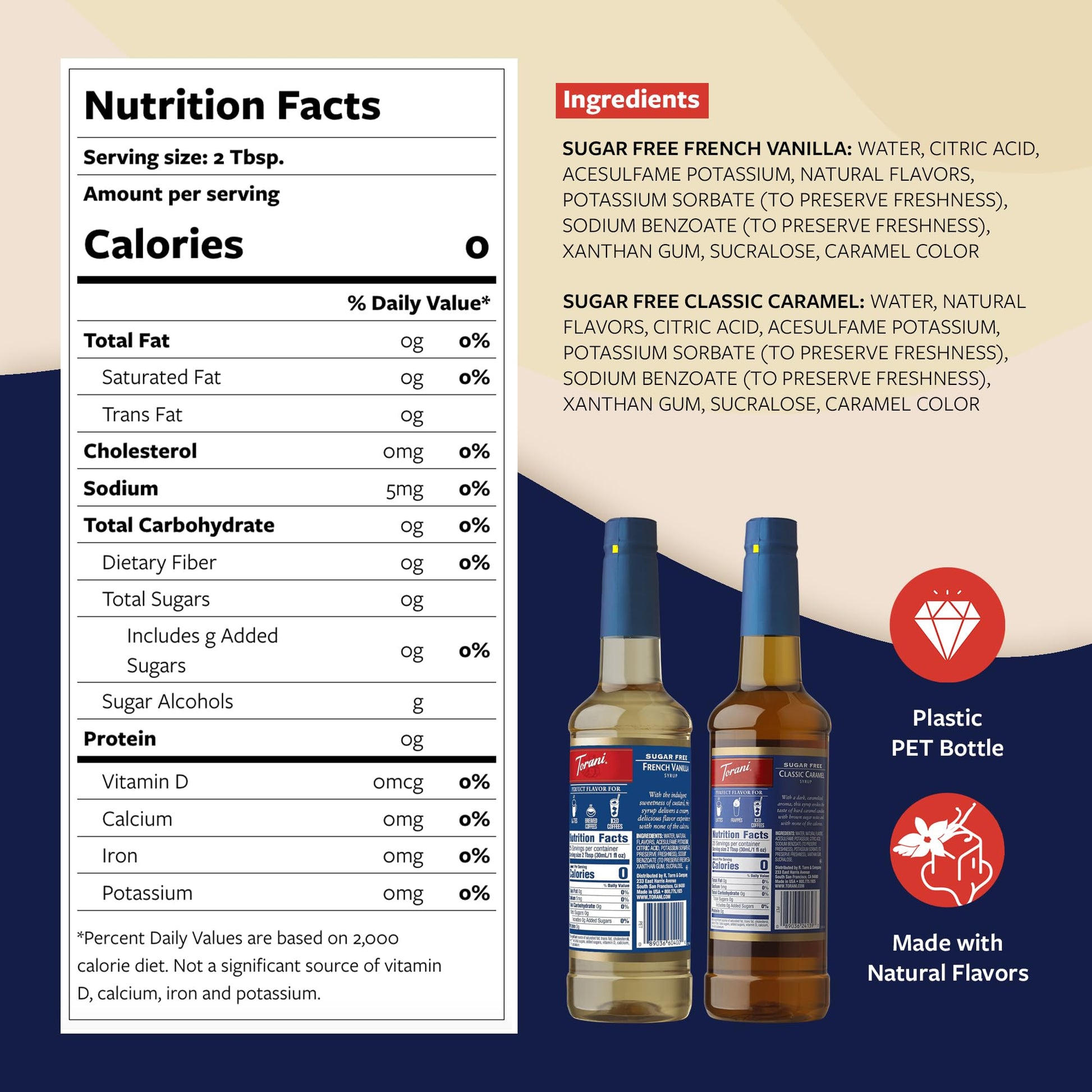 Q: Are these syrups suitable for low-calorie or sugar-free diets?A: Yes, both the Torani Classic Caramel and French Vanilla syrups are sugar-free and low in calories, making them an excellent choice for those looking to enjoy sweet flavors without the added calories.