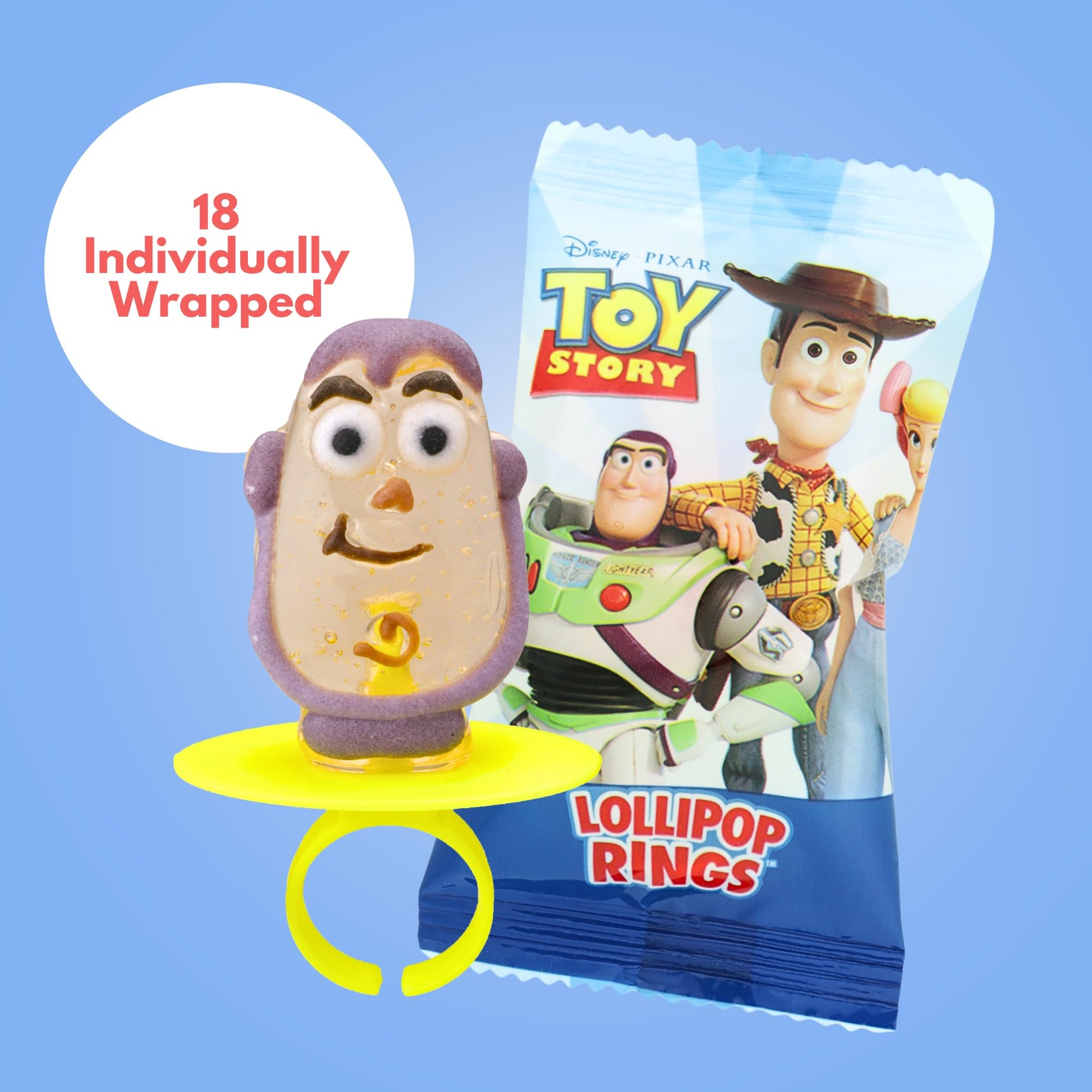 6.77 Ounce Box Of 16 Assorted Character Lollipop Rings - Features Buzz Lightyear, Rex, Hamm, And Forky Shaped Lollipop Rings - Lollipops Are Artificially Flavored Strawberry, Blue Raspberry, Green Apple, And Watermelon - Lollipop Rings Are Not Recommended For Children Under 3 Years Of Age - These Are Perfect For Handing Out For Trick Or Treat, Giving As Party Favors, Or To Add To A Costume