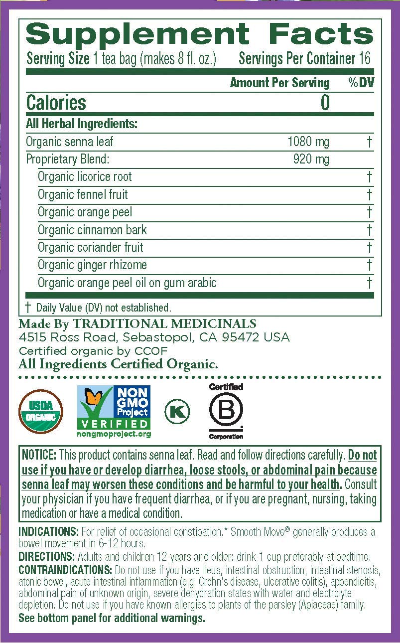 - Q: What are the key ingredients in Traditional Medicinals Organic Smooth Move Tea? A: Traditional Medicinals Organic Smooth Move Herbal Stimulant Laxative Tea contains a blend of natural herbs designed to gently relieve occasional constipation. The main ingredient is senna, which is known for its laxative properties, along with other herbal components that contribute to its effectiveness.