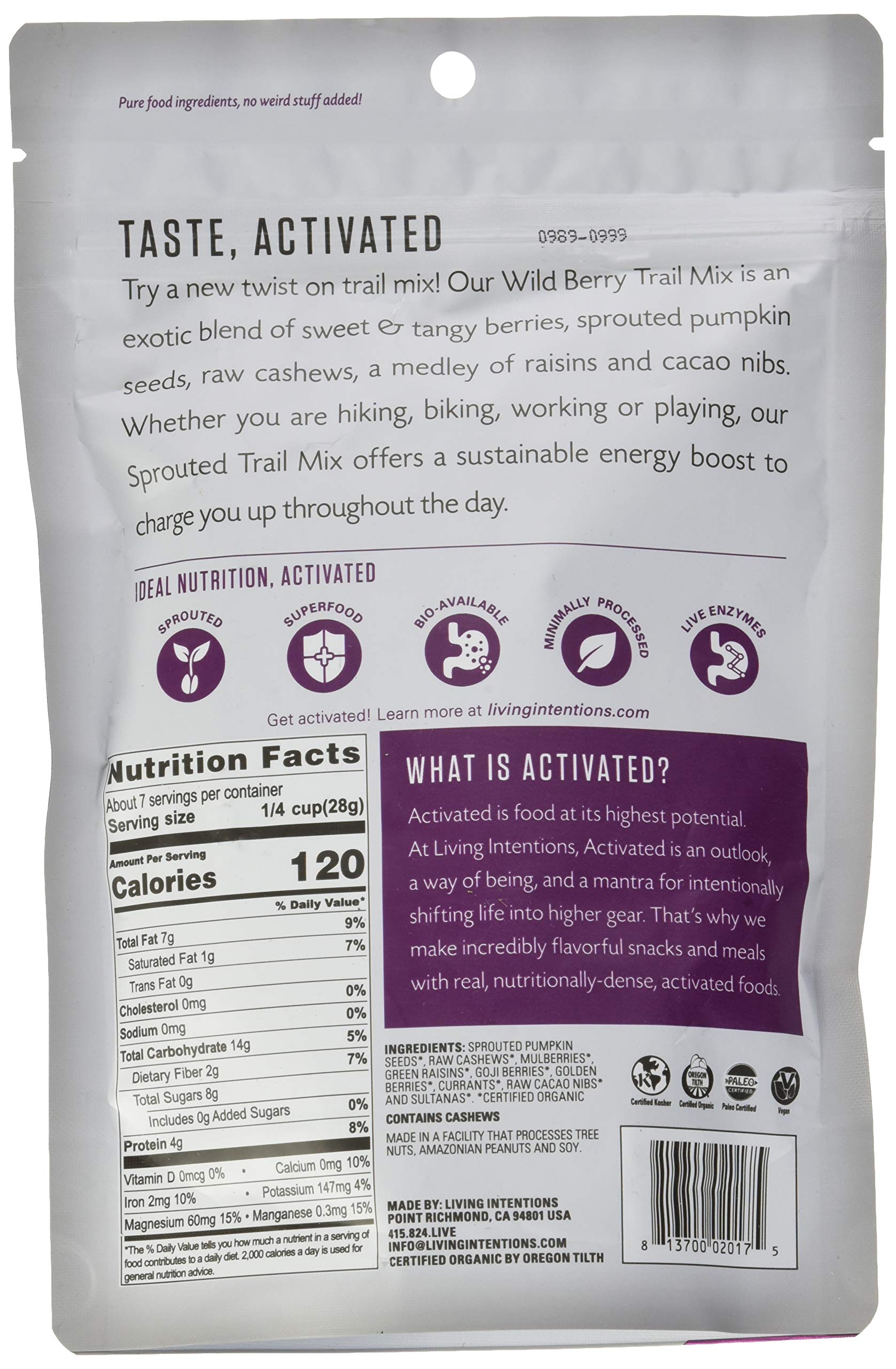 Q: What are the main ingredients in TRAIL MX WLD BRY SPROUTED?A: TRAIL MX WLD BRY SPROUTED primarily features wild berry ingredients, carefully selected to provide a nutritious and flavorful snack option.