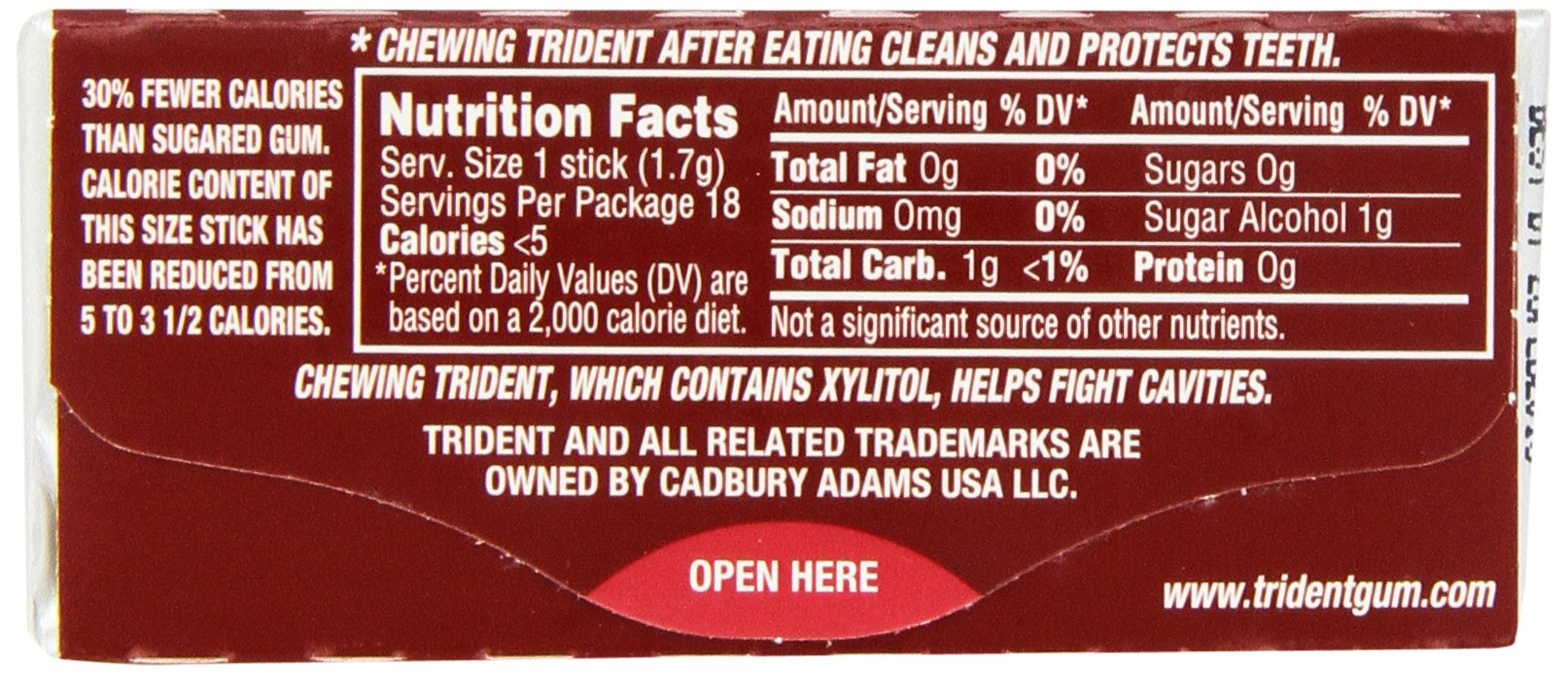 Get Close-Up Confidence With Trident Sugar Free Gum, The Easy Way To Freshen Breath And Help Protect Against Tooth Decay. Four Out Of Five Dentists Recommend Chewing Trident After Eating And Drinking To Clean And Protect Teeth. With 30% Fewer Calories Than Sugared Gum, Trident Is Sweetened With Xylitol Which Provides Long Lasting Flavor, Fights Plaque, And Restores Ph Balance To Maintain Healthy Smiles. Pop A Piece Of Mouthwatering Trident Gum For A Refreshing Taste That Keeps Going As Long As You Do.
