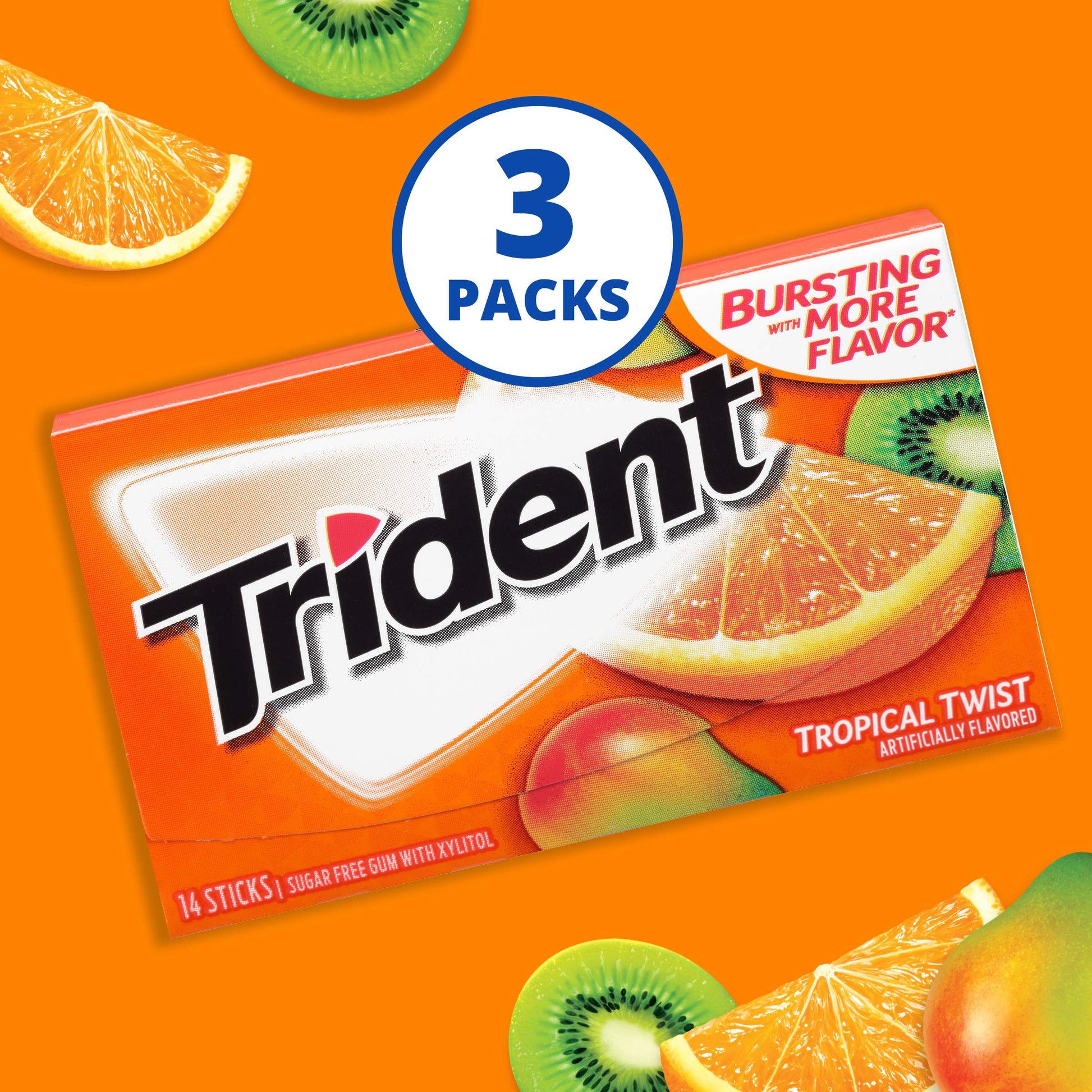 Three Packs With 14 Pieces Each, 42 Total Pieces, Of Trident Tropical Twist Sugar Free Gum (Packaging May Vary) | Tropical Fruit Flavored Sugar Free Chewing Gum | Fruit Gum That Helps Clean And Protect Teeth While Providing Fresh Breath | Trident Gum 9 Pack Of Sugarless Gum Made With Xylitol | Chewing Trident Fruit Flavored Gum After Eating And Drinking Cleans And Protects Teeth