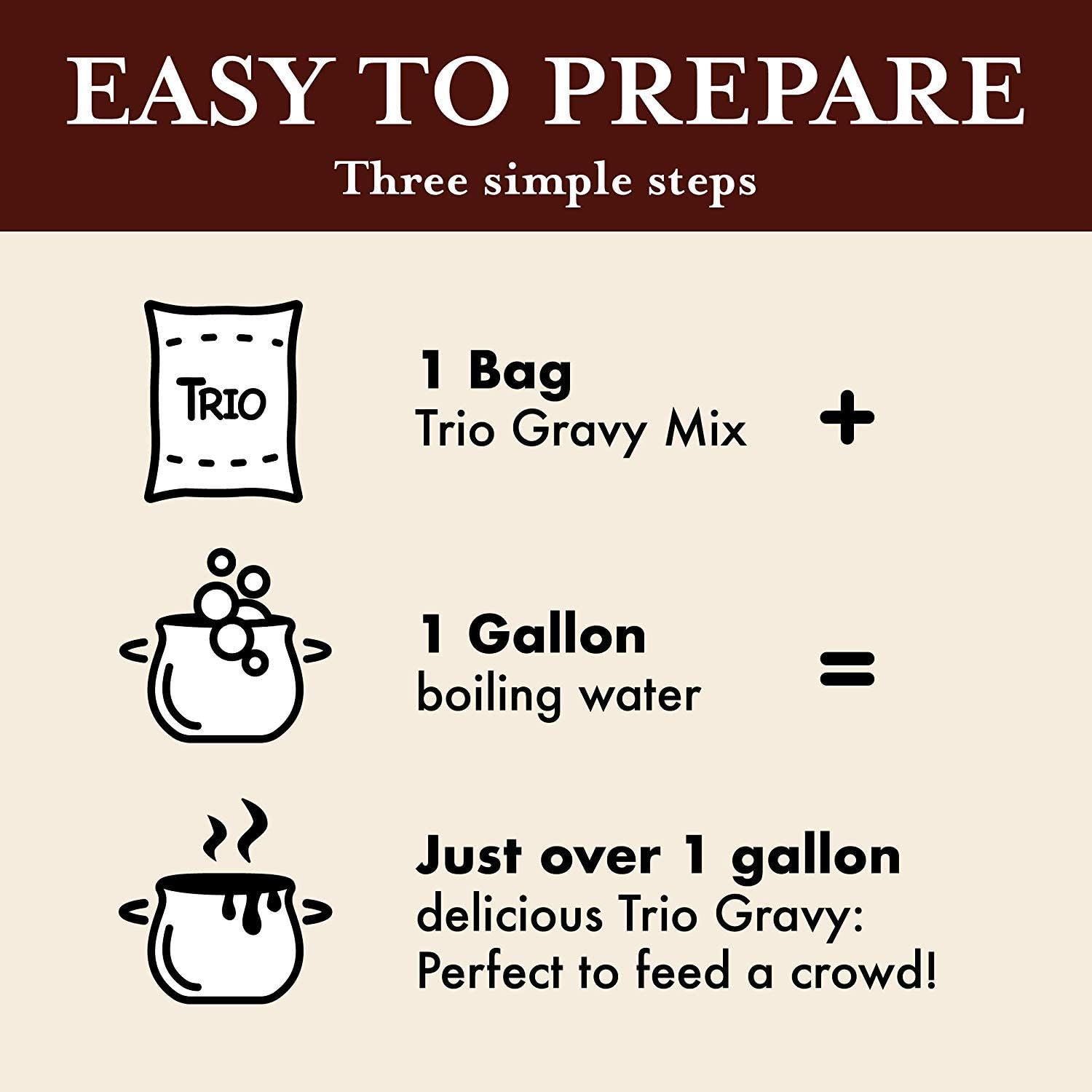 Q: How do I prepare TRIO Low Sodium Poultry Gravy Mix?A: To prepare the gravy, simply open the pouch using the easy tear feature, pour the entire package into 1 gallon of boiling water (212°F), and stir briskly with a wire whisk until smooth and thickened. This process takes just one minute.