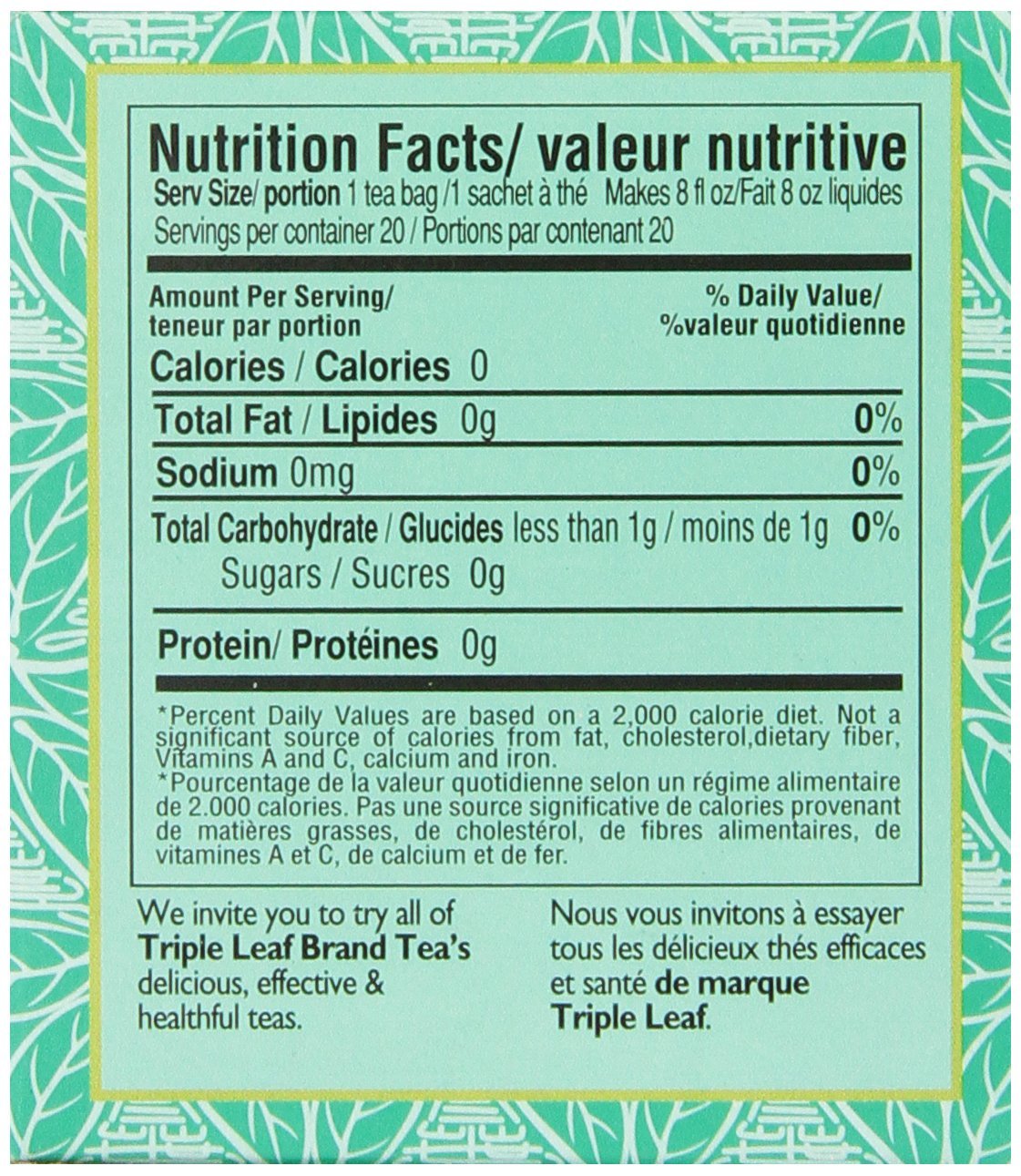 Q: What size is the packaging of Triple Leaf Brand Special Relaxing Herb Tea?A: Triple Leaf Brand Special Relaxing Herb Tea comes in a convenient 20-count pack, making it easy to enjoy multiple servings.