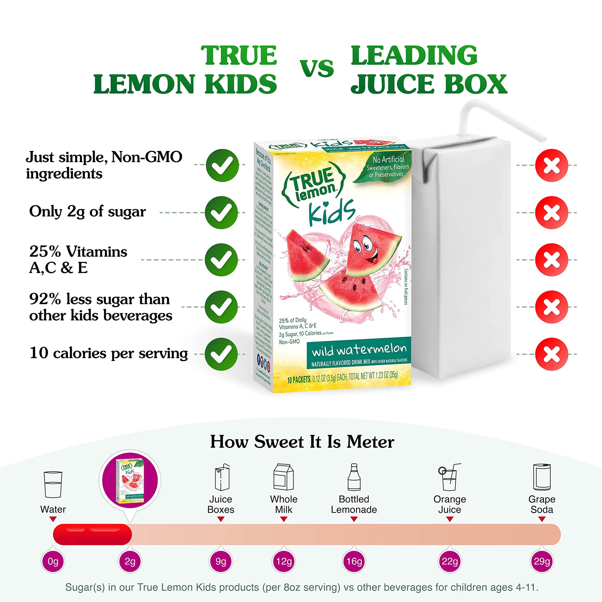Q: How much sugar is in each serving of TRUE LEMON KIDS Wild Watermelon?A: Each serving of TRUE LEMON KIDS Wild Watermelon contains only 2 grams of sugar, which is 92% less sugar than leading children's beverages like juice and soda.