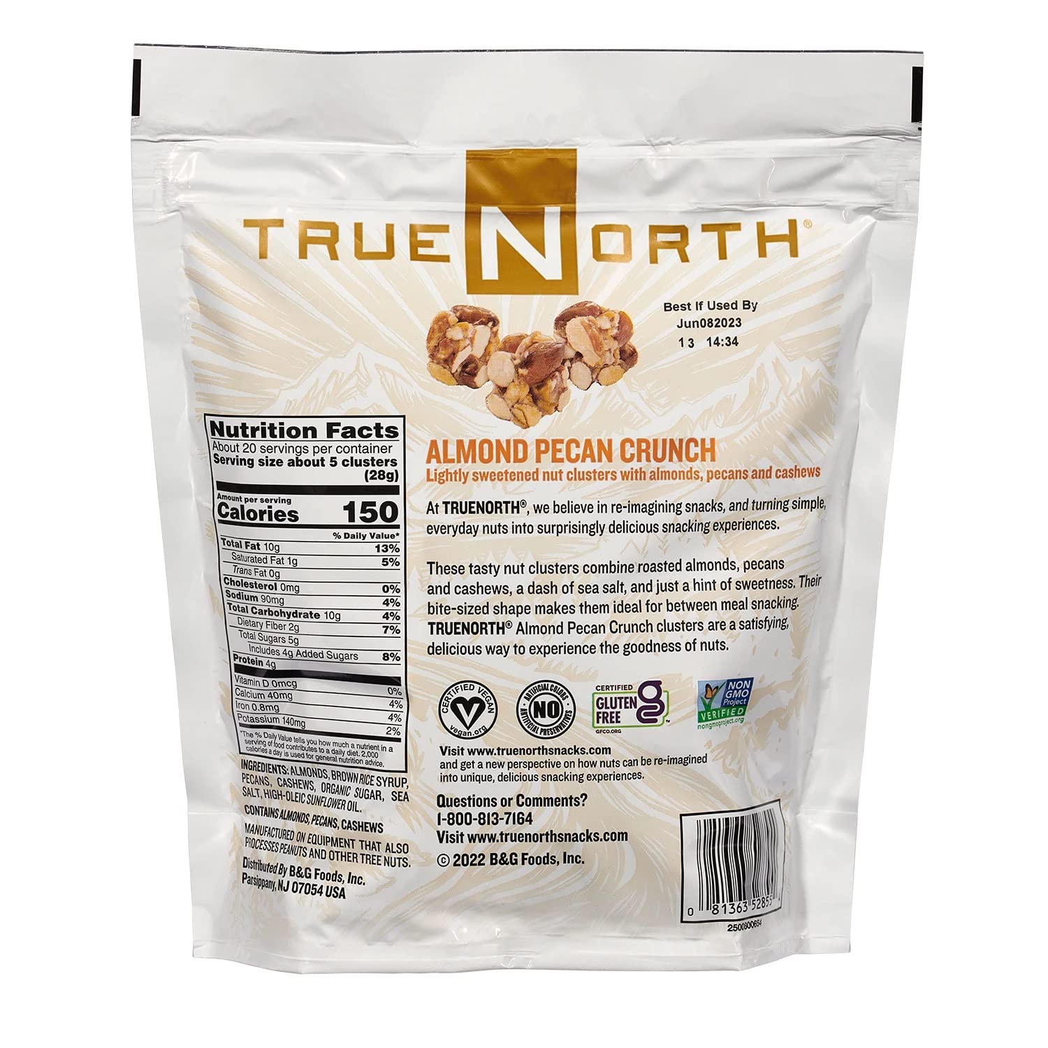 Lightly sweetened nut clusters with almonds, pecans & cashews. Certified Vegan. vegan.org. Certified Gluten free. gfco.org. Non GMO Project verified. nongmoproject.org. No artificial colors. No artificial preservatives. At TrueNorth, we believe in re-imagining snacks, and turning simple, everyday nuts into surprisingly delicious snacking experiences. These tasty nut clusters combine roasted almonds, pecans and cashews, a dash of sea salt, and just a hint of sweetness. Their bite-sized shape makes them ideal for between meal snacking. Truenorth almond pecan crunch clusters are a satisfying, delicious way to experience the goodness of nuts. vegan.org. nongmoproject.org. gfco.org. www.truenorthsnacks.com. Visit www.truenorthsnacks.com and get a new perspective on how nuts can be re-imagined into unique, delicious snacking experiences. Questions or comments? 1-800-813-7164. Visit www.truenorthsnacks.com.