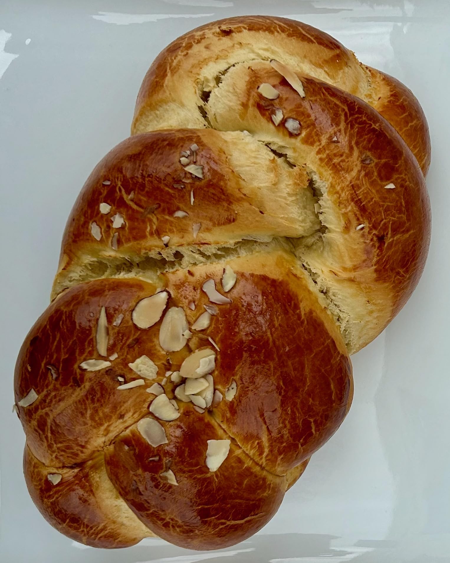 Tsour ki is a sweet yeast bread that, like many yeast breads, requires two risings. It is delicious toasted with butter. Tsour ki is made in specific shapes at Easter, Christmas and New Years. This Tsour ki loaf is flavored with traditional mahlepi and mastic and is available year-round.