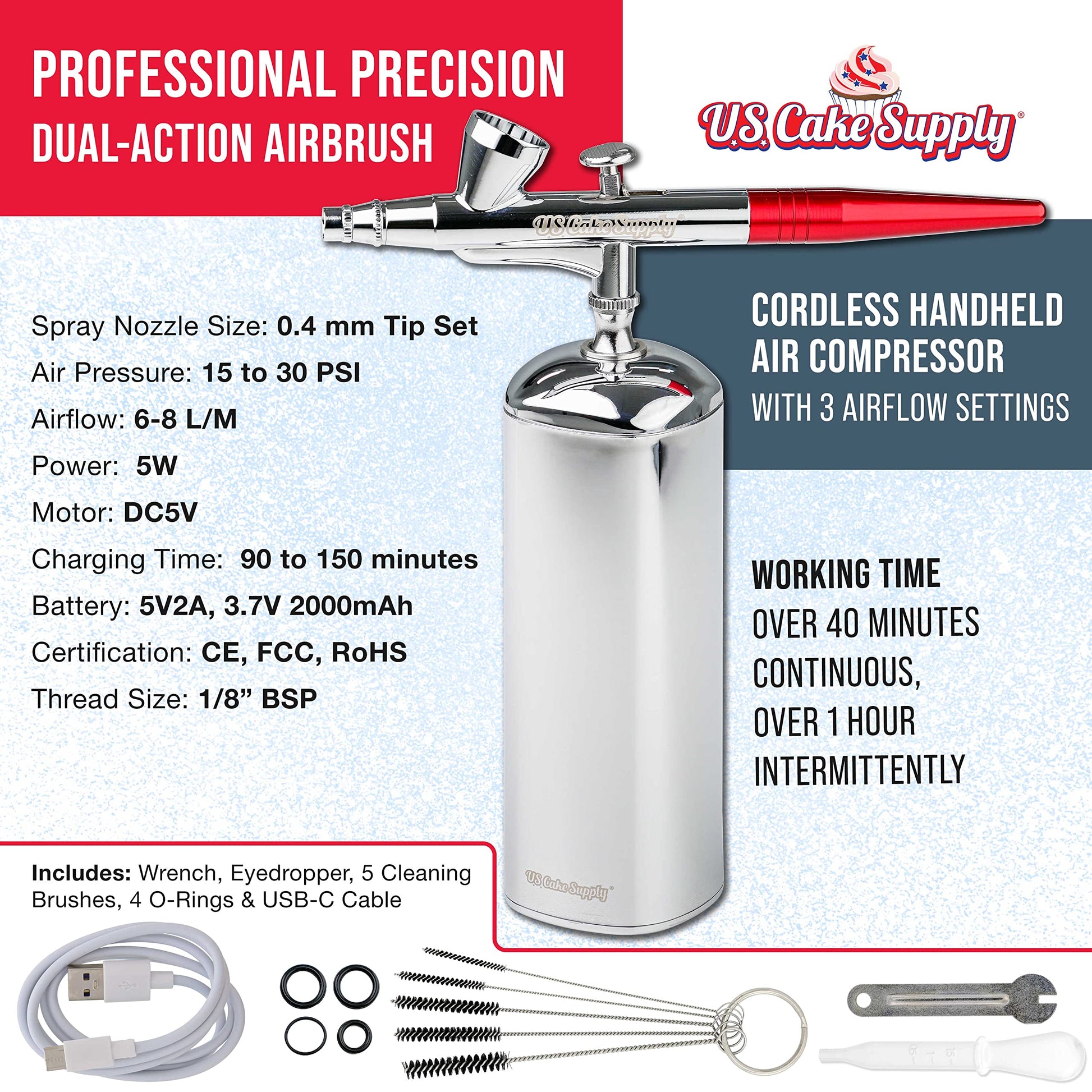 Q: What is included in the U.S. Cake Supply Cordless Handheld Airbrush Cake Decorating System?A: The kit includes a cordless airbrush, a full selection of 12 vivid airbrush food colors, and accessories necessary for decorating cakes, cupcakes, cookies, and desserts.