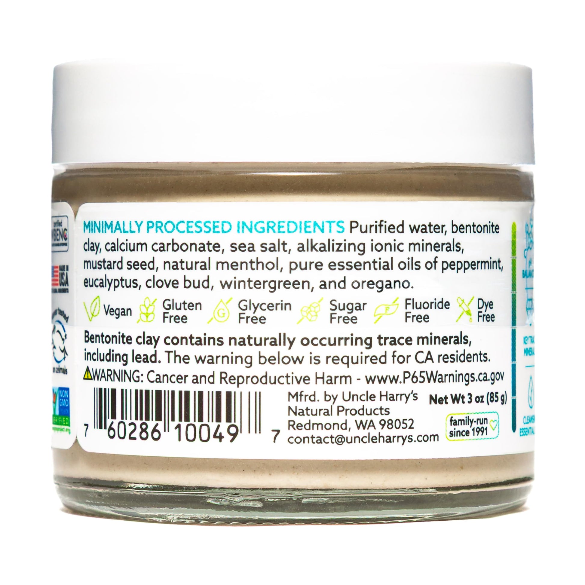 • Q: What ingredients are in Uncle Harry's Peppermint Remineralizing Toothpaste? A: Uncle Harry's Peppermint Remineralizing Toothpaste is made with natural ingredients including bentonite clay, calcium carbonate, colloidal silver, sea salt, mustard seed, eucalyptus, clove, wintergreen, and oregano essential oils. It is free from fluoride, artificial sweeteners, and synthetic preservatives.
