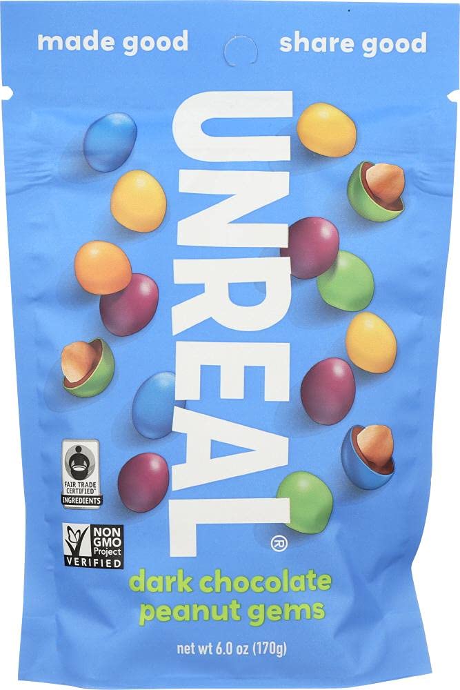 Certified Organic By Usda. Unreal - Dark Chocolate Peanut Gems - 5 Oz. (142 G) Unreal Dark Chocolate Peanut Gems Has The Crunch Of Peanut In Smooth Dark Chocolate. It Also Is Fair Trade Certified By Fair Trade Usa. 72% Cocoa, Non-Gmo Verified, Colored By Veggies And Has An Unreal Taste. Unreal Taste! No Soy Ingredients Colors From Natural Sources 100% Real, Nothing Artificial