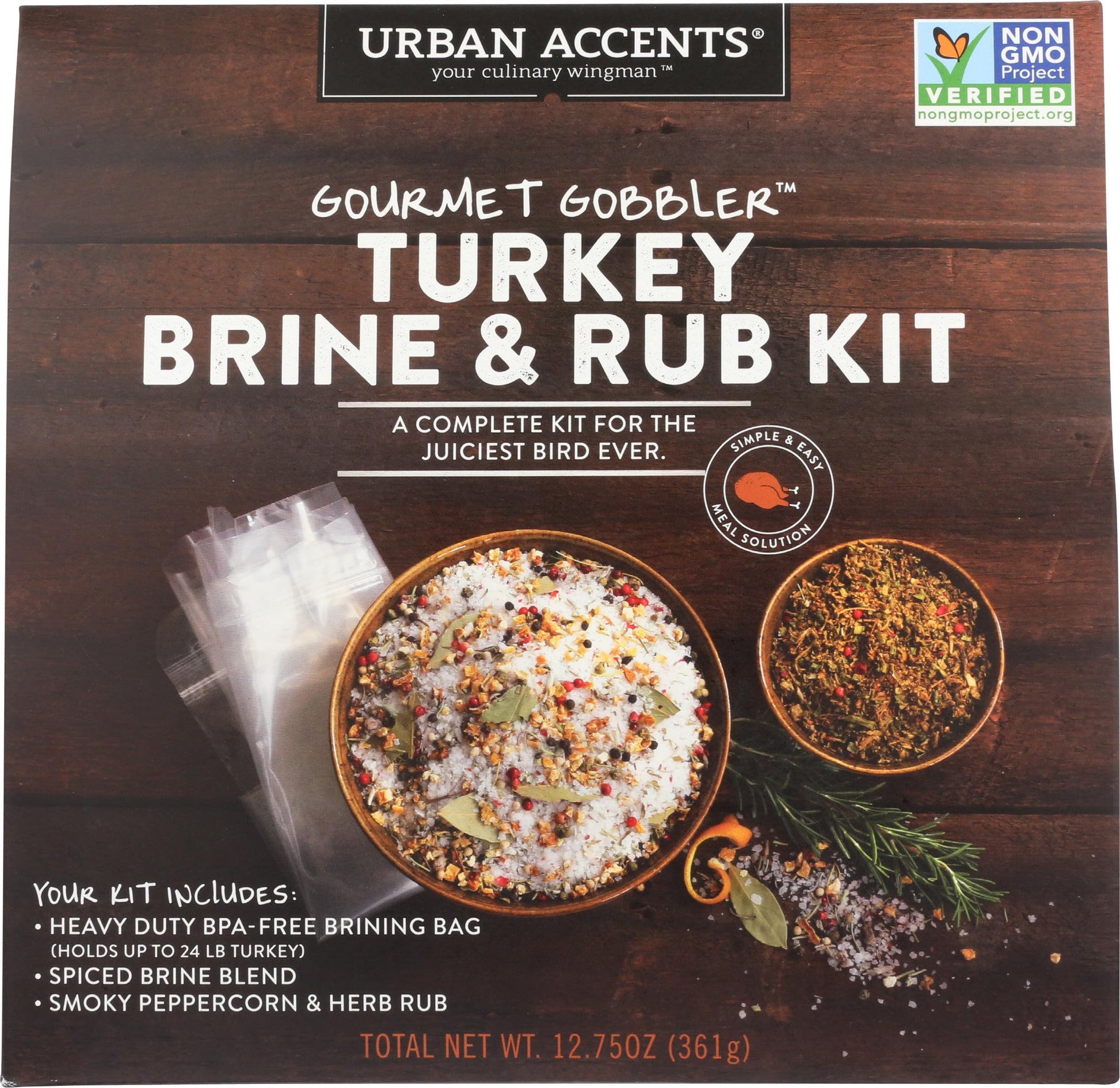 Q: What is included in the Urban Accents Gourmet Gobbler Turkey Brine Kit?A: The kit includes a spiced brine blend, smoky peppercorn turkey rub, a heavy-duty BPA-free brine bag, and step-by-step instructions, making it ideal for first-time turkey roasters.