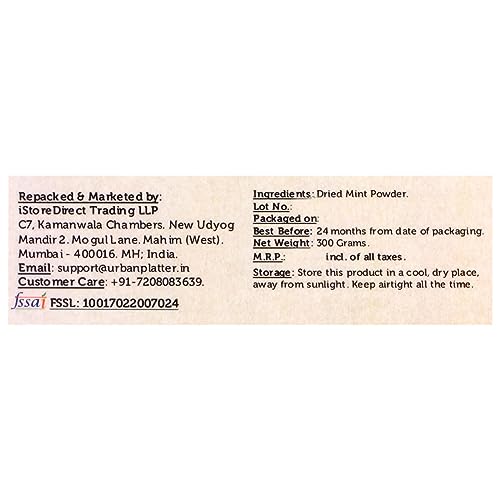 Urban Platter Dried Mint Powder, 300G/ 10.58Oz [All Natural, Premium Quality, Pudina Powder]Dried Mint Powder Or Dried Mint Is An Aromatic And Flavourful Condiment That Makes Dishes, Beverages All The More Appetizing.Widely Known As A Good Appetizer, This Herb Based Powder Increase The Digestive System And Helps In The Secretion Of Gastric Juices. The Mint Powder Is Suggested By Health Experts To Treat Obesity.Beautiful Fresh, Cooling And Aromatic. Small Quantity Required To Add In The Food For Mint Taste And Flavour.Toss Into Raitas, Nimbu-Paani, Dips, Marinades Or Add To Chutneys For Generally Used Spice Blend, Rice Blends, Soups, Salad Dressings, Sauces, Gravies, Salsas, Condiments, Canned Foods, Frozen Foods, Snack Foods, Meats & Processed Foods, Soup Powders, Food Premixes, Health Food, Extruded Snacks Food And Instant Food Products.Urban Platter - Simply Good Food.
