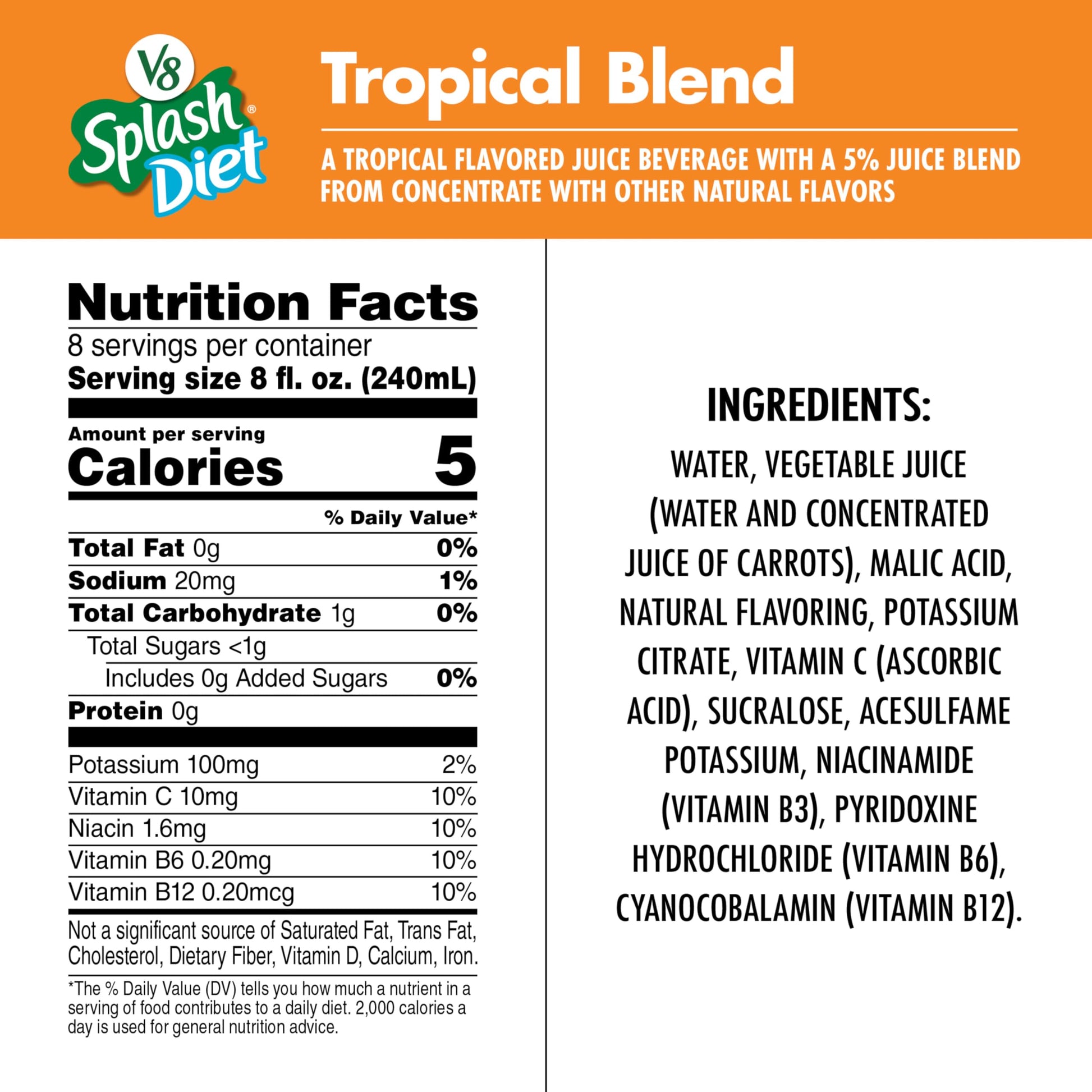 Heres A Drink That Will Have Everyone In Your Family Saying, Yum. Deliciously Refreshing, V8 Splash Comes In A Variety Of Flavors, From Berry Blend To Mango Peach. Each Member Of Your Family Is Sure To Find A Personal Fave. Made With Natural Fruit Flavors And A 5% Blend Of Juice, Youll Love The Burst Of Flavor In Every Sip. Fun At Snack Time, Dinnertime, And All Those Times In Between.V8 Splash Diet Tropical Blend Is The Perfect Thirst-Quencher For Your Whole Family, Without The Calories. Antioxidant C & B Vitamins Are Whirled Together With The Flavors Of Apples, Pineapples, Kiwis, Limes And Mangos- Making For A Deliciously Refreshing Taste.