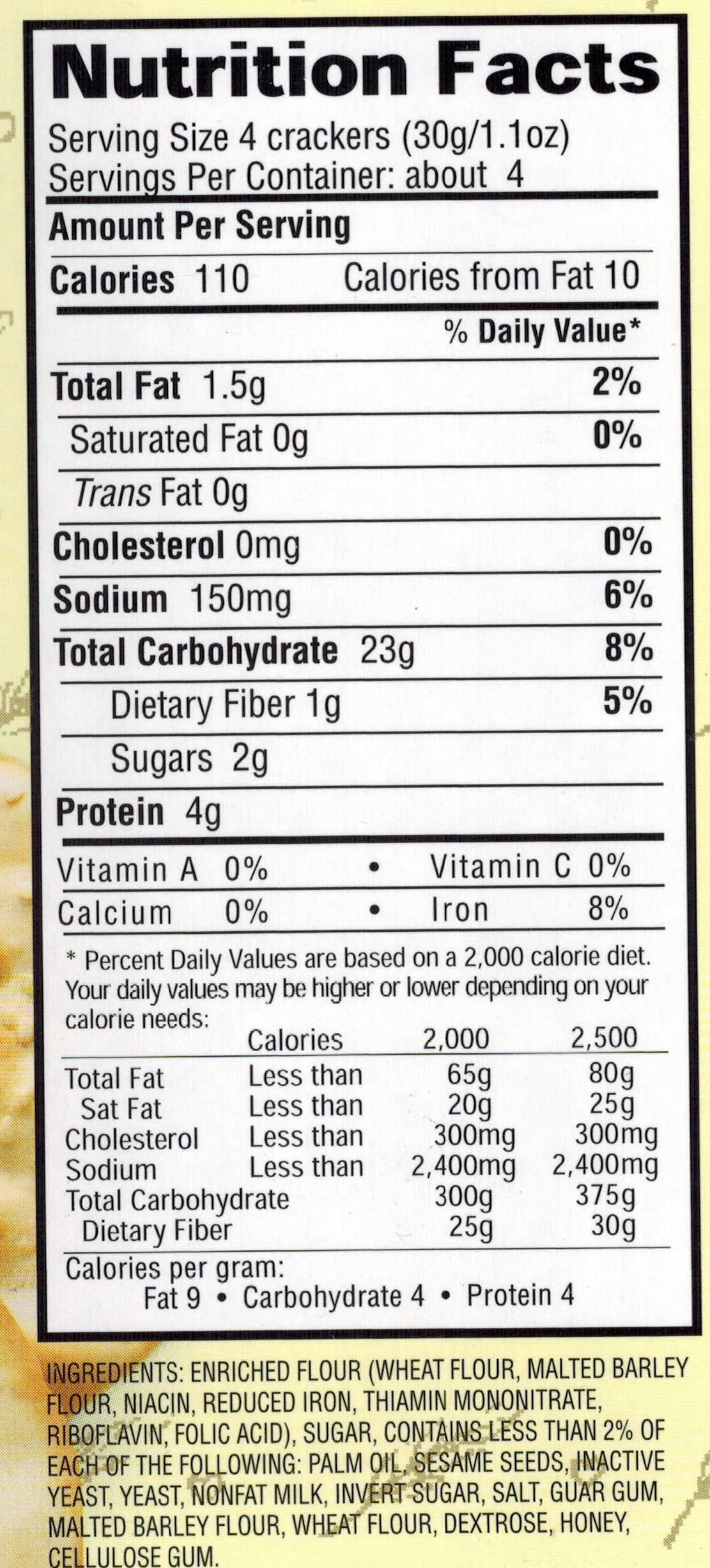 Ingredients: Enriched Flour (Wheat Flour, Malted Barley Flour, Niacin, Reduced Iron, Thiamin Mononitrate, Riboflavin, Folic Acid), Sugar, Contains Less Than 2% Of Each Of The Following: Palm Oil, Sesame Seeds, Inactive Yeast, Yeast, Nonfat Milk, Invert Sugar, Salt, Guar Gum, Malted Barley Flour, Wheat Flour, Dextrose, Honey, Cellulose Gum.