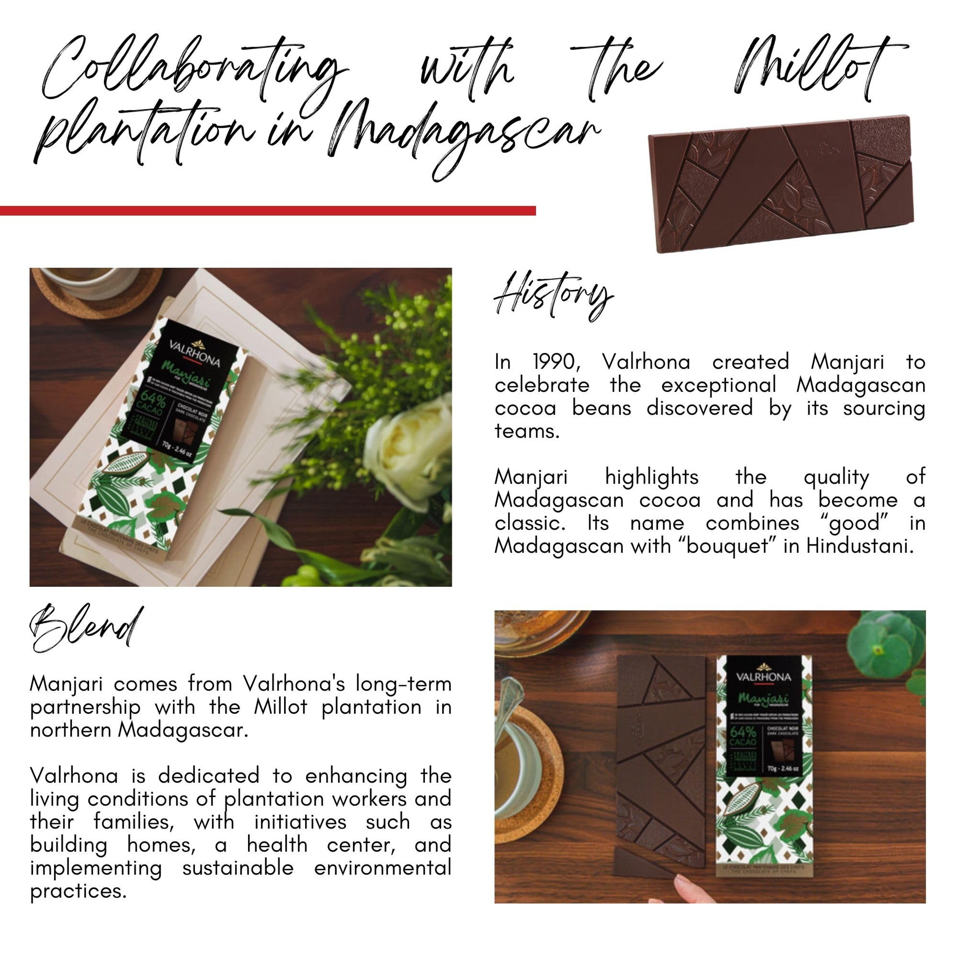 Premium Baking Bars made with the World’s Finest ChocolateValrhona’s premium baking bars are made from the world’s finest chocolate. Our baking bar range is both wide and varied to fit any dessert personality.DARK MANJARI 64%If the chocolate world gave out medals for all-around it would be MANJARI. It is everyone’s favorite chocolate and could literally work in any chocolate baking application. Keep a bar of MANJARI within arms reach at all times. And if we must say so, it makes for premium on-the-go snacking.Valrhona, the World’s Finest Chocolate Since 1922Valrhona has been producing the world’s finest chocolate in the small village of Tain L’Hermitage, France since 1922. From the beginning, company founder and Pastry Chef Albéric Guironnet was dedicated to the creation of unique, artisan quality chocolate with complex, balanced and consistent flavors.Our mission of excellence continues as the gastronomic traditions of the renowned Rhone Valley find expression in every mouthwatering taste of Valrhona’s superb chocolate.For almost a century, Valrhona has created a range of unique and recognizable aromatic profiles by perfecting techniques for enhancing the flavor of rare cocoa beans, grown on land masterfully selected for its terroir.Today, leading Pastry Chefs and discerning gourmets rely on Valrhona’s expertise to experience the best that chocolate can be.Our Commitment to the EnvironmentStrongly determined to cut its environmental impact in half by 2025, Valrhona has already considerably reduced its gas emissions, waste production, and energy and water consumption on industrial sites.