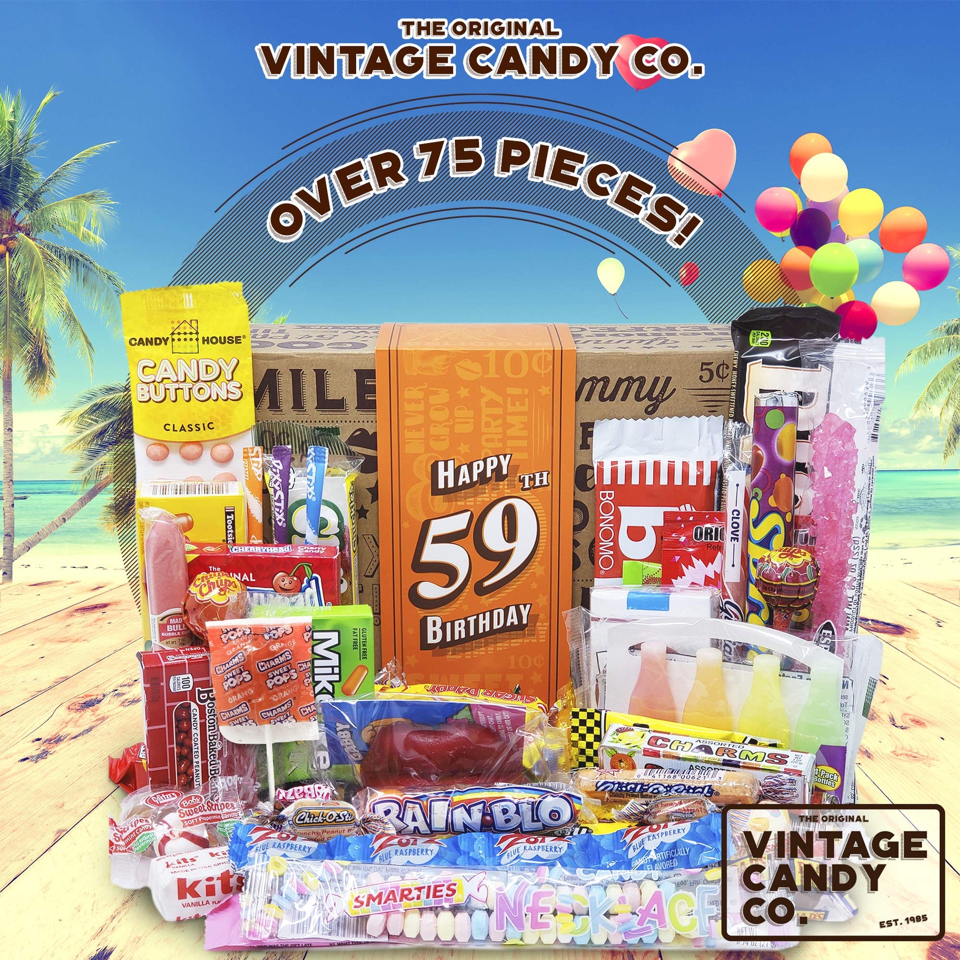 Q: Can this candy box be used as a party decoration?A: Absolutely! The Vintage Candy Co. 1965 Deluxe Candy Care Package serves as both a delightful gift and an attractive addition to any 59th birthday party décor, adding a nostalgic charm to the celebration.