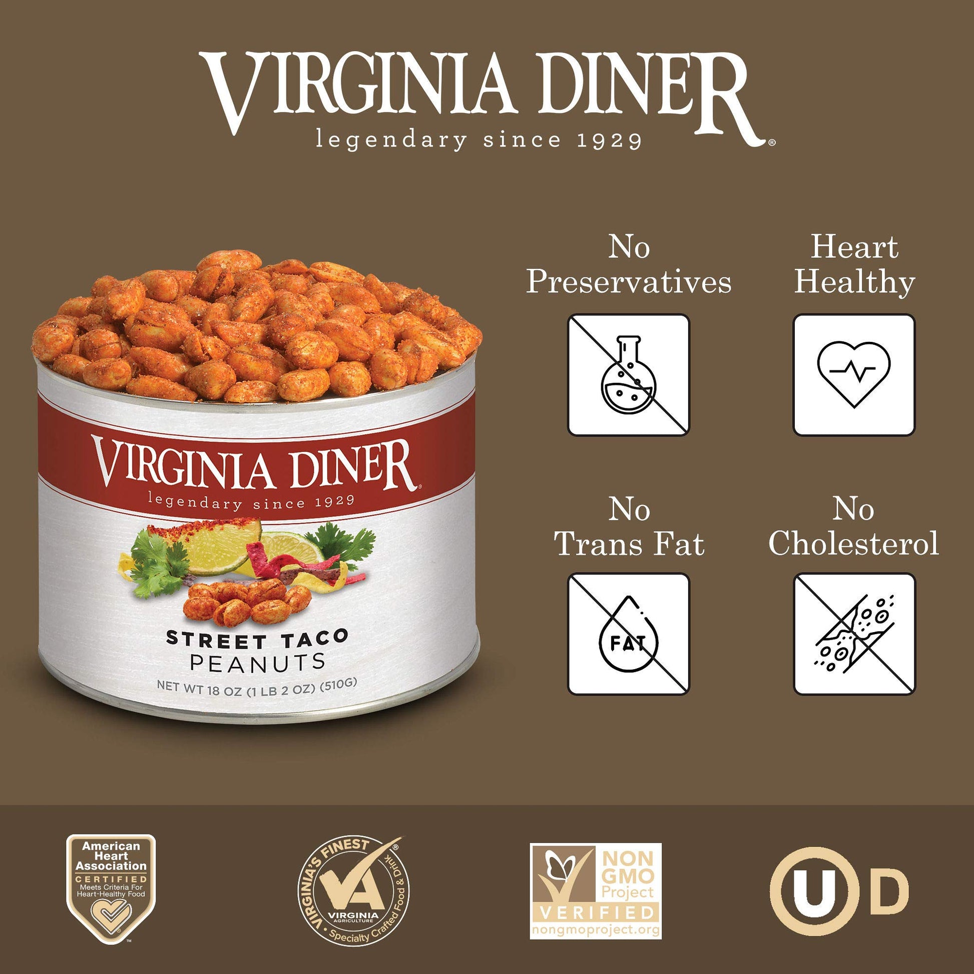- Q: What are the main ingredients in Virginia Diner Gourmet Street Taco Peanuts? A: Virginia Diner Gourmet Street Taco Peanuts are made from premium Virginia peanuts, seasoned with a tangy taco blend, cilantro, and lime. They are cooked in all-natural, Non-GMO oil, ensuring a crunchy and flavorful snack without preservatives or trans fats.