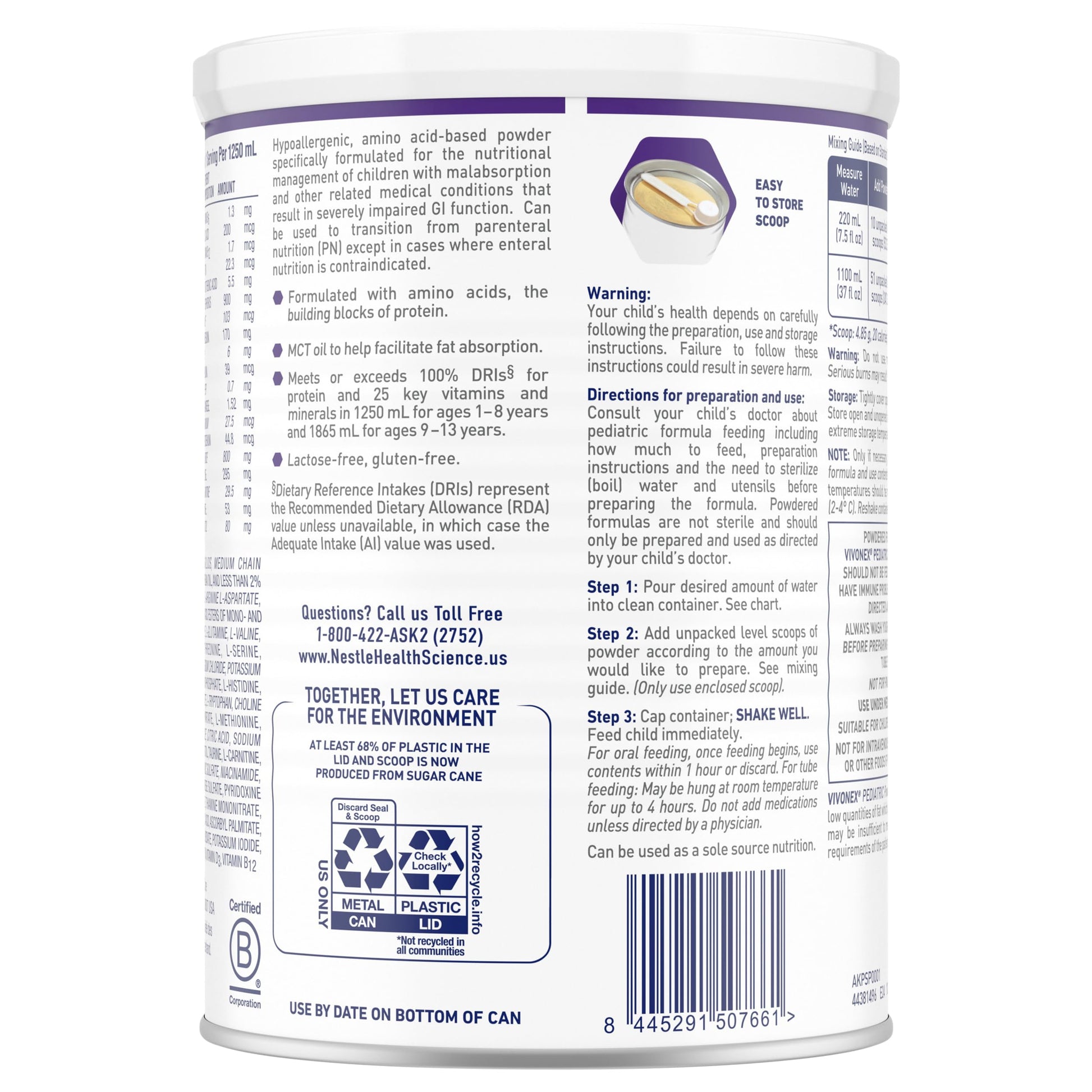 VIVONEX PEDIATRIC Elemental Powder is a nutritionally complete powder designed for children ages 1-13 that can be used as sole source nutrition via tube feeding or consumed orally. Featuring protein from amino acids and 70% of fat from MCT, VIVONEX PEDIATRIC Elemental formula for kids is hypoallergenic, Non-GMO, Certified Halal and suitable for gluten-free & lactose free diets. IMPORTANT NOTE: NOT FOR PARENTERAL USE.