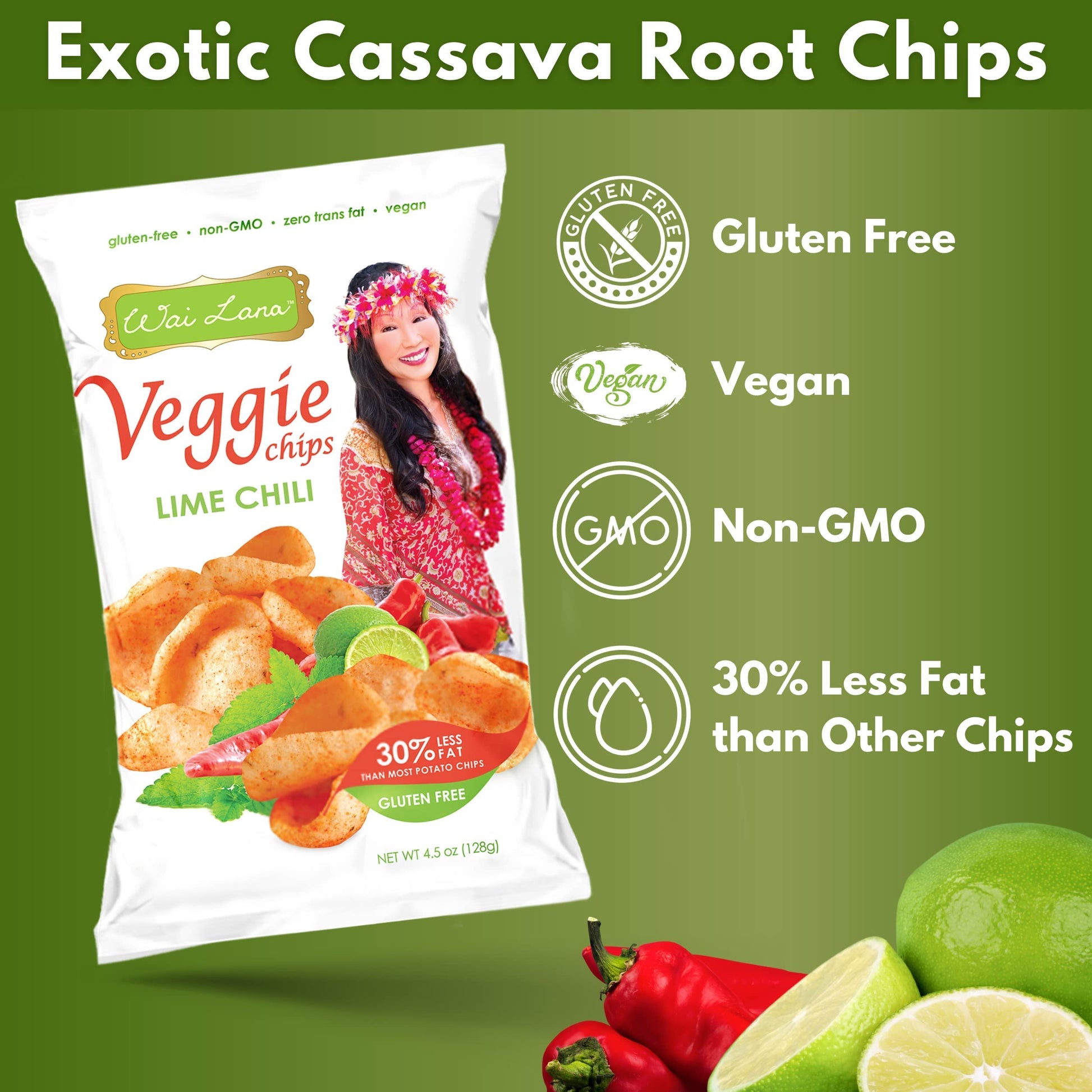 Healthy Snack: Winner Of The Healthy Gourmet Snack Awards | Delicious: Lime Chili Veggie Chips Offer A Tantalizing Alternative For Snack Lovers. Bursting With Lime Chili Flavor And The Unforgettable Crunch, These Delicious Wai Lana Chips Are Hard To Resist | Less Fat: These Veggie Chips Contain 30% Less Fat Than Most Potato Chips. Zero Trans Fat, No Cholesterol Or Preservatives | Vegan, Gluten-Free, Non-Gmo: A Healthy Treat For A Healthier Family. These Cassava Chips Are 100% Vegan | Ingredients: Cassava (Yuca Chips), Tapioca Flour, Palm Olein Oil, Cane Sugar, Leek, Sea Salt, Onion, White Pepper, Chili, Dextrin, Garlic, Malic Acid, Lime Oil, Paprika.