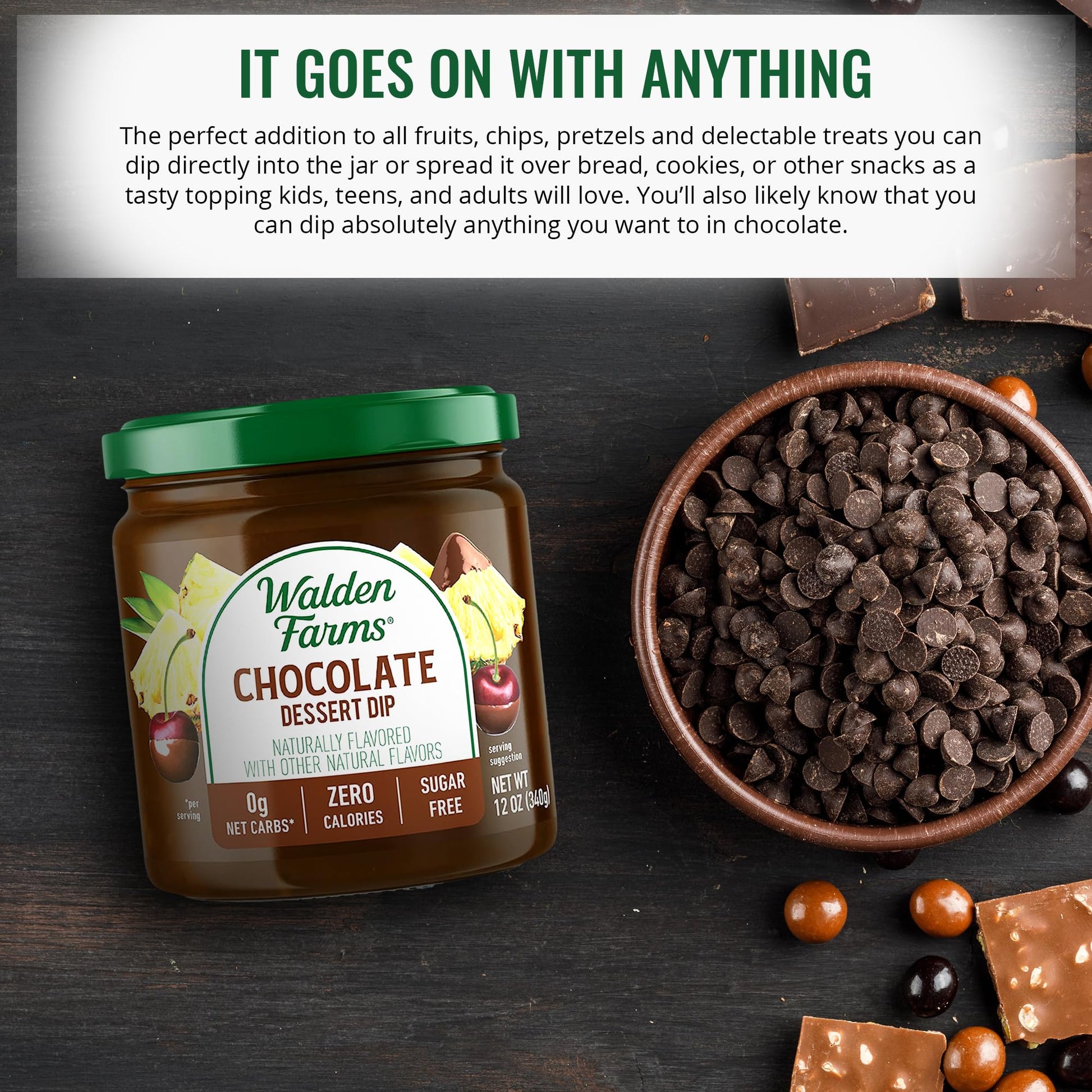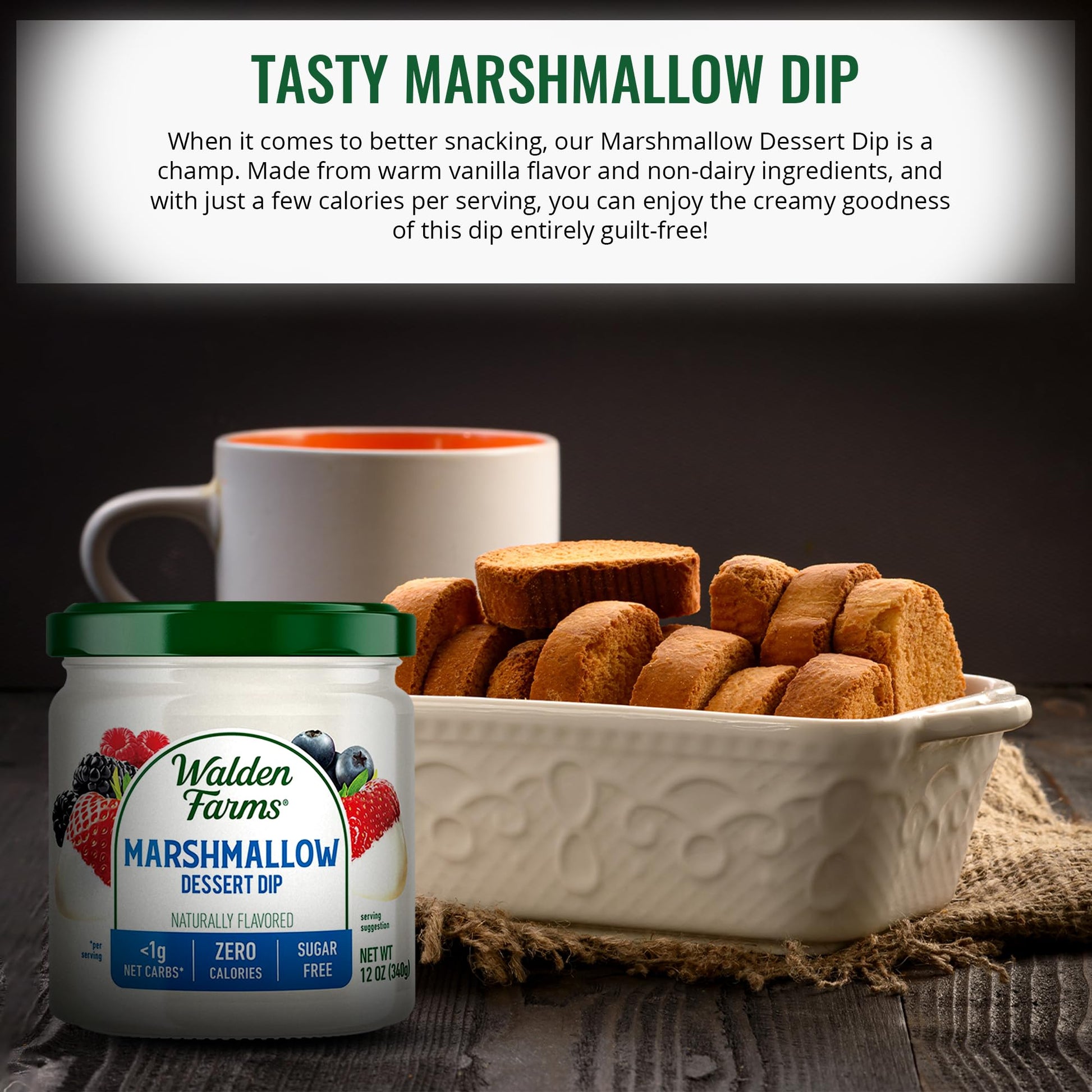Q: What are the flavors available in Walden Farms Dessert Dip?A: Walden Farms Dessert Dip comes in a variety of delicious flavors, including Chocolate and Marshmallow, allowing you to enjoy different taste experiences.